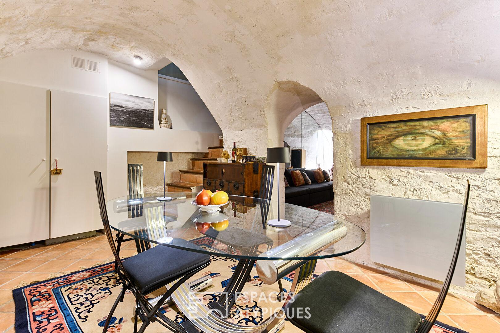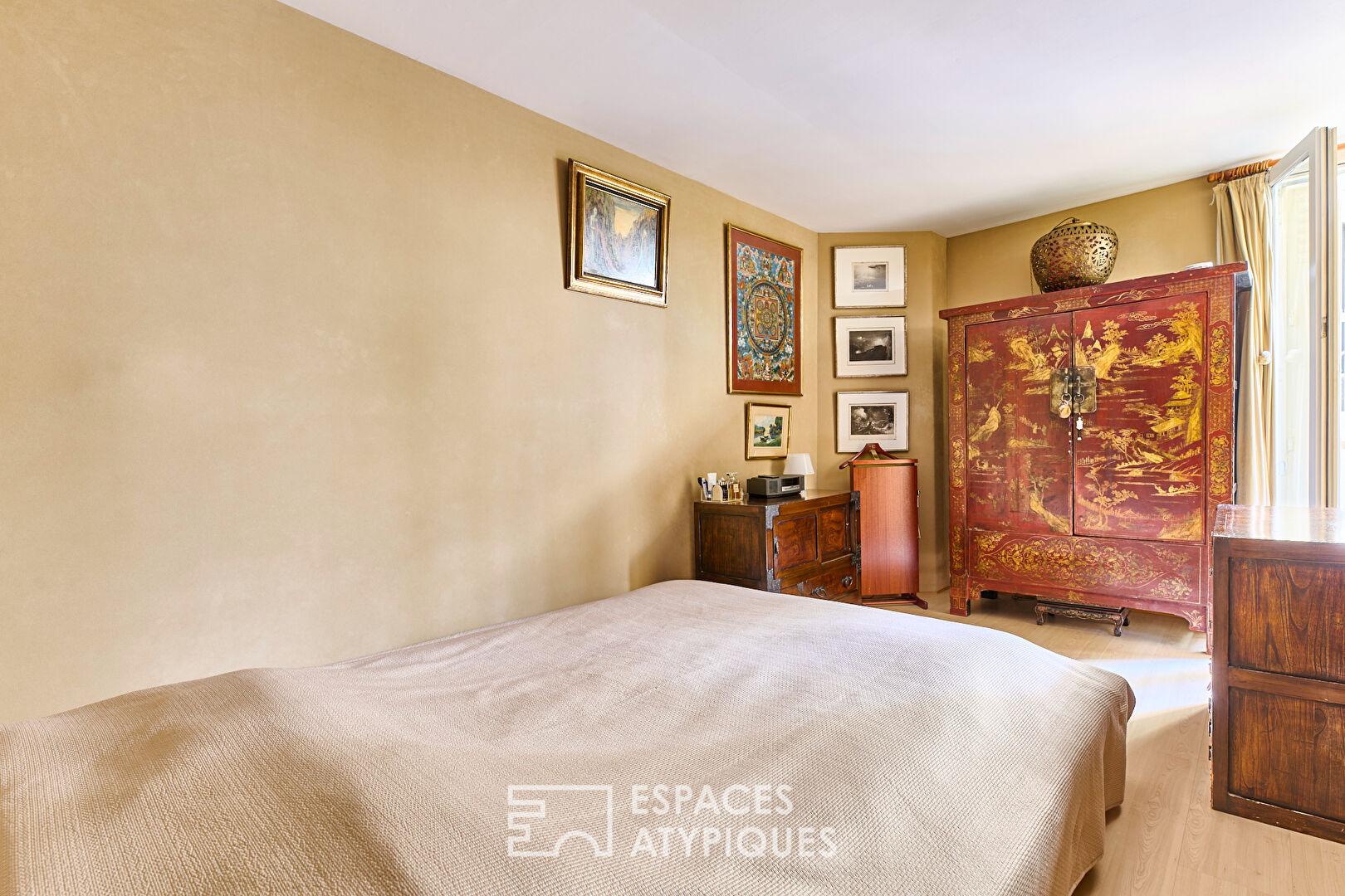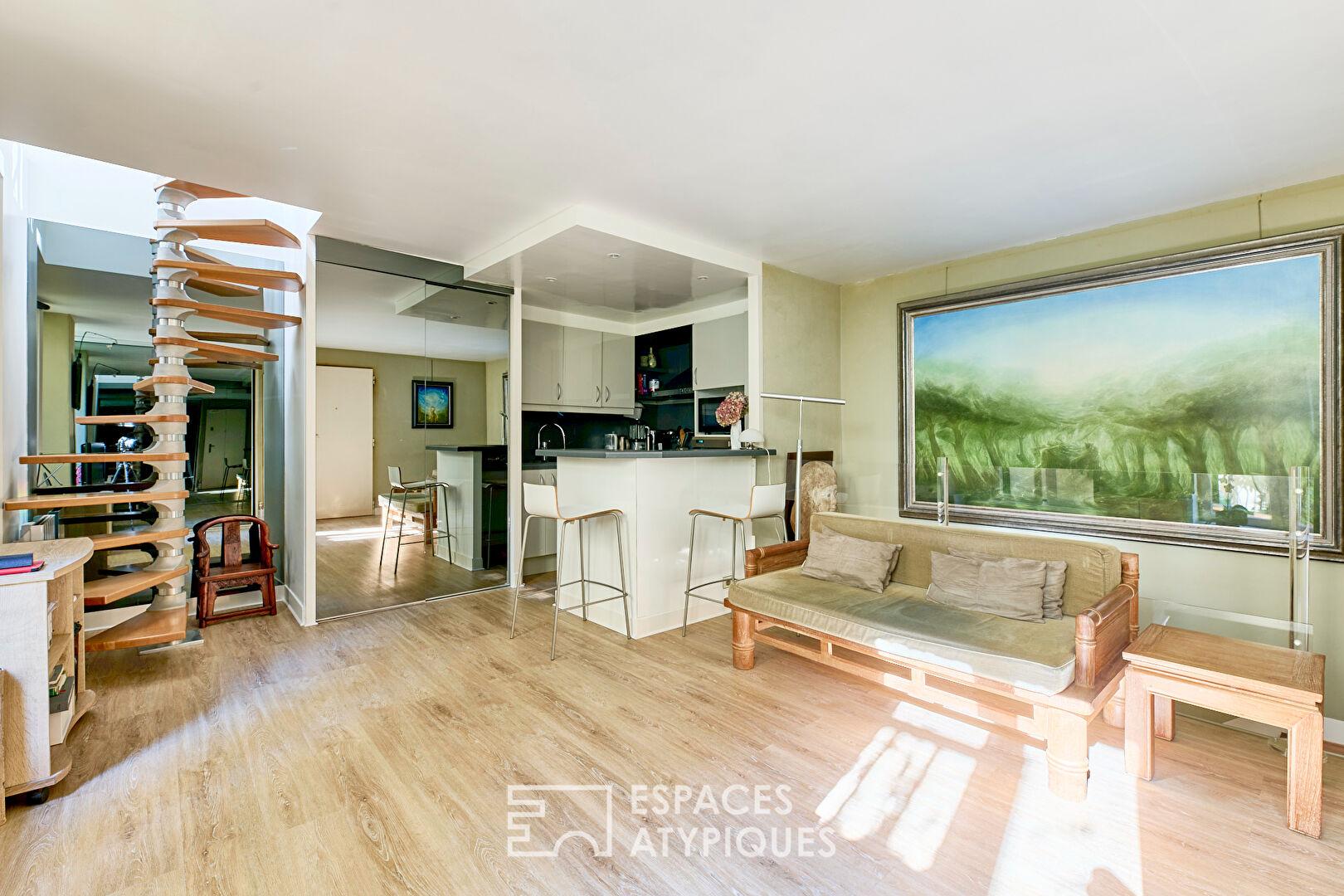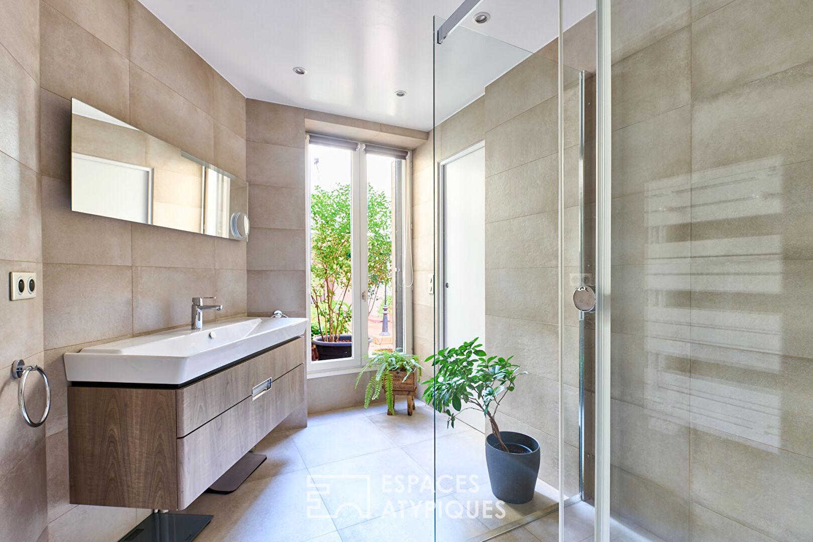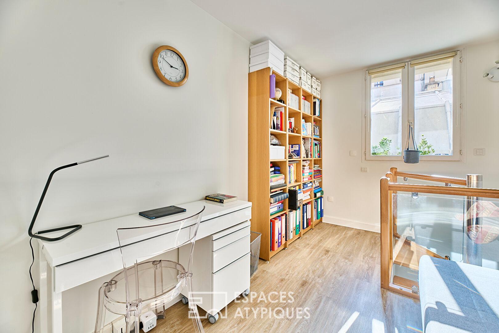Au fond d’une cour végétalisée, entre la Cité des Fleurs et le Square des Epinettes, se niche ce duplex avec vaste souplex totalisant 190,51 m2 (53,45 m2 Carrez).