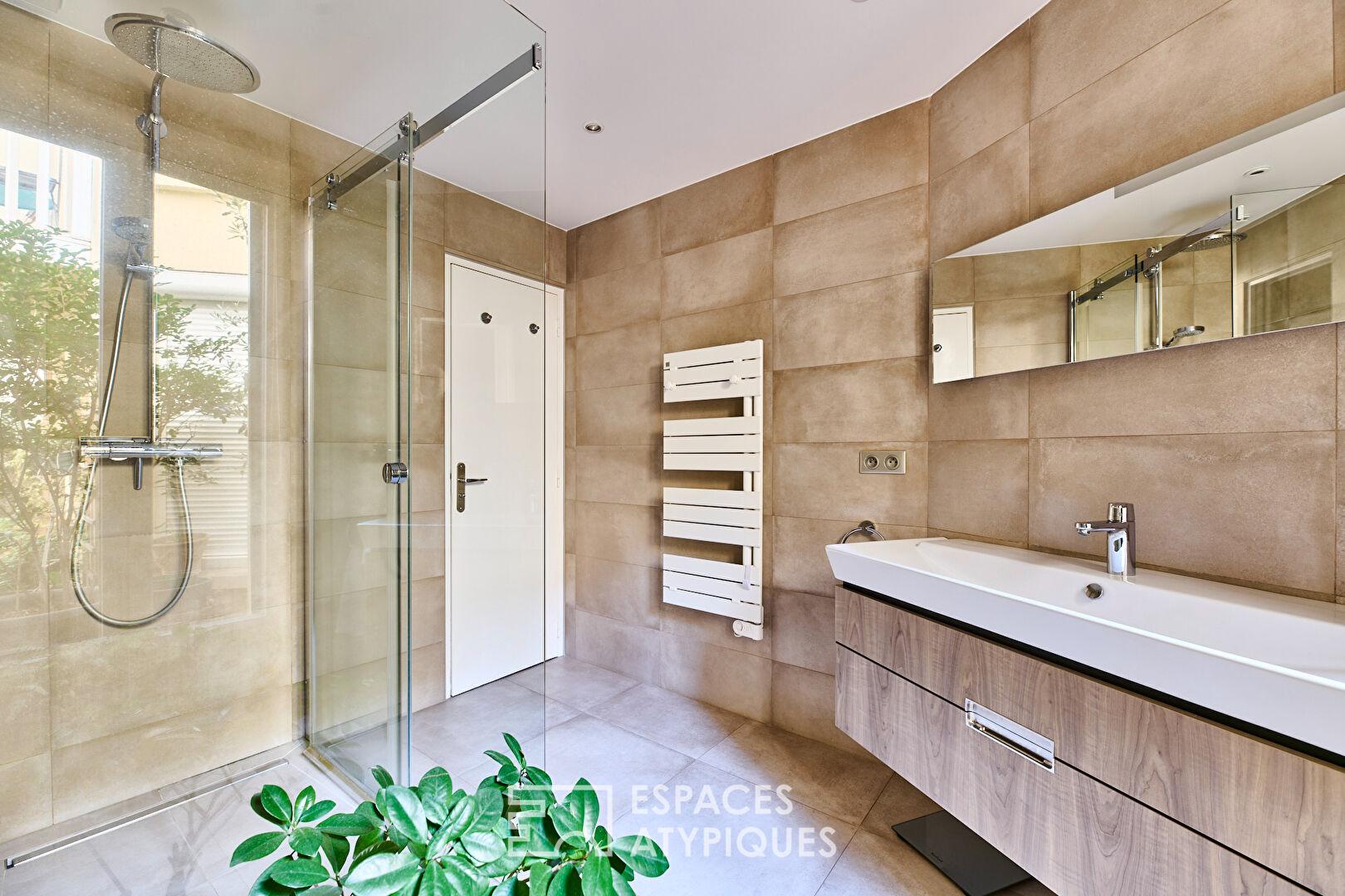 Le sous-sol mène élégamment à une autre partie en rez-de-cour, où se trouvent une chambre de 13 m2 ainsi qu’une salle de d’eau dotée d’une douche à l’italienne.