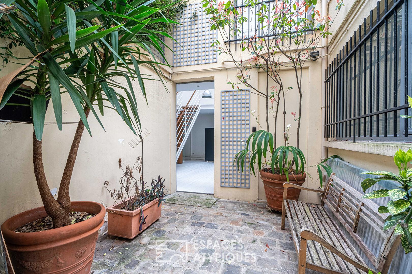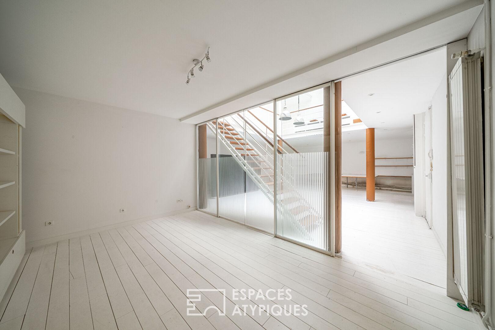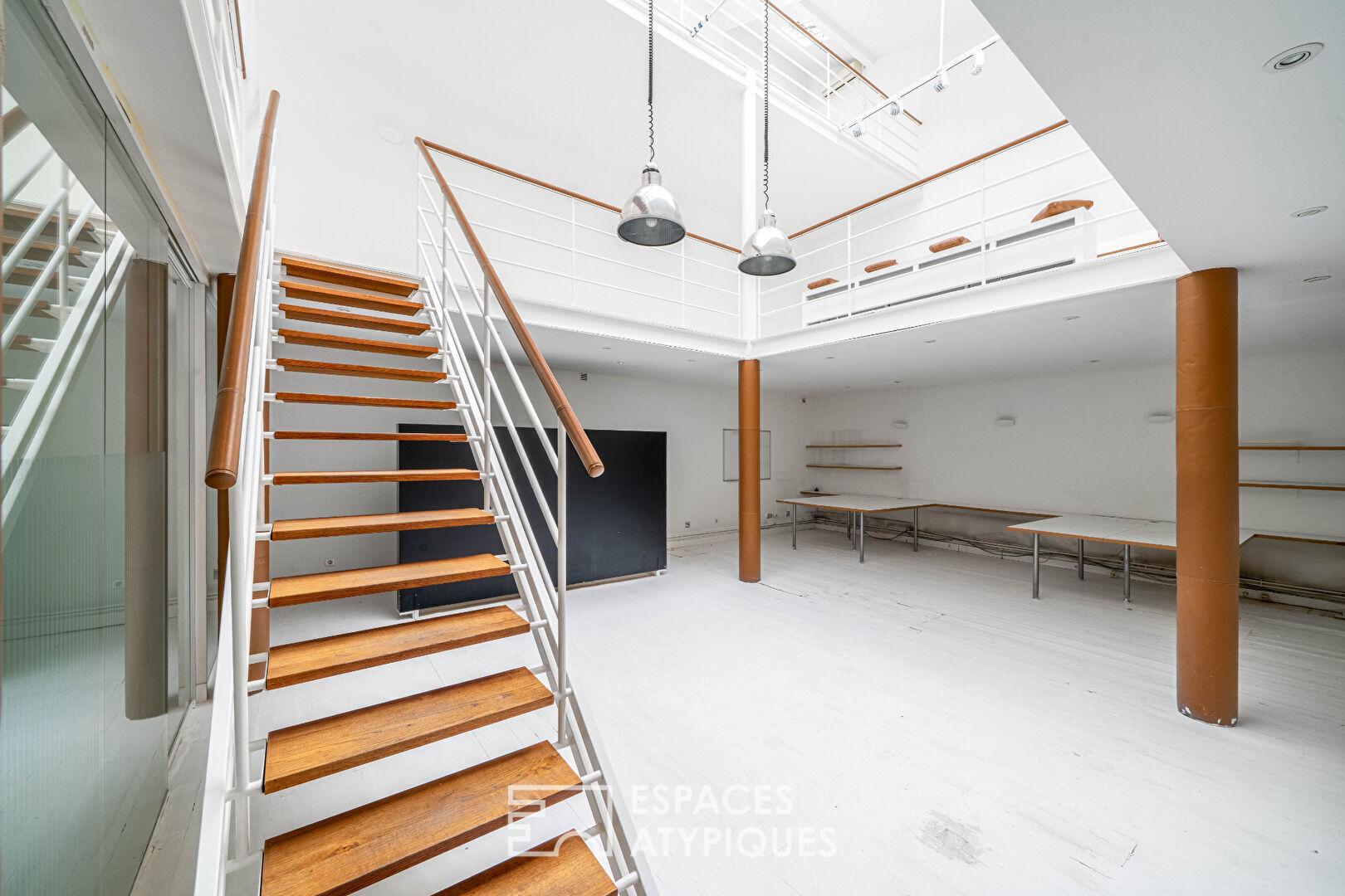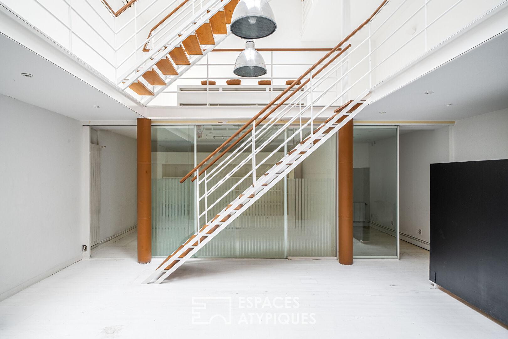 Situé en seconde ligne, au sein d’un bâti indépendant au calme absolu, ce loft d’activité totalise 211,14 m² (210,58 m² Carrez) répartis sur trois niveaux.