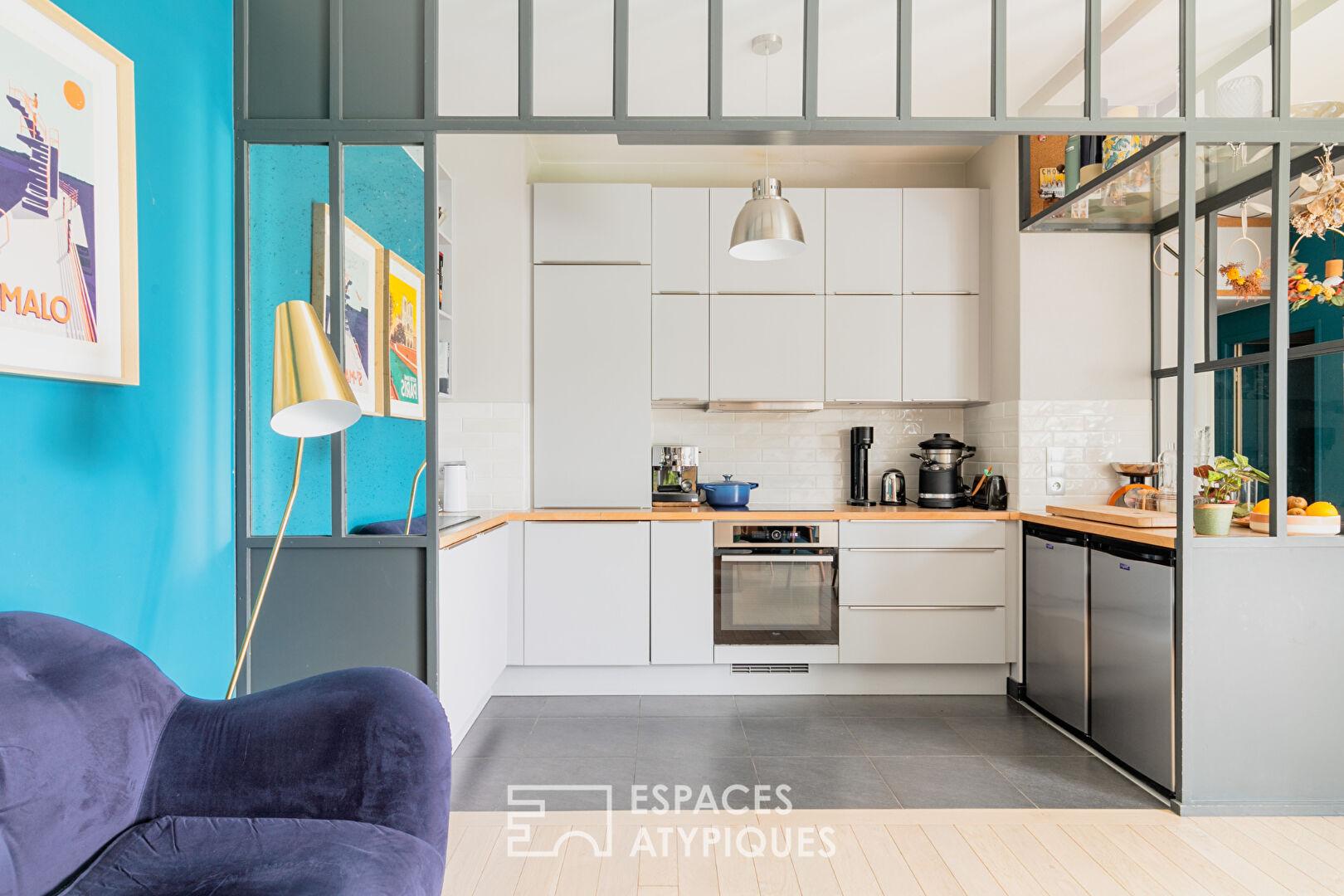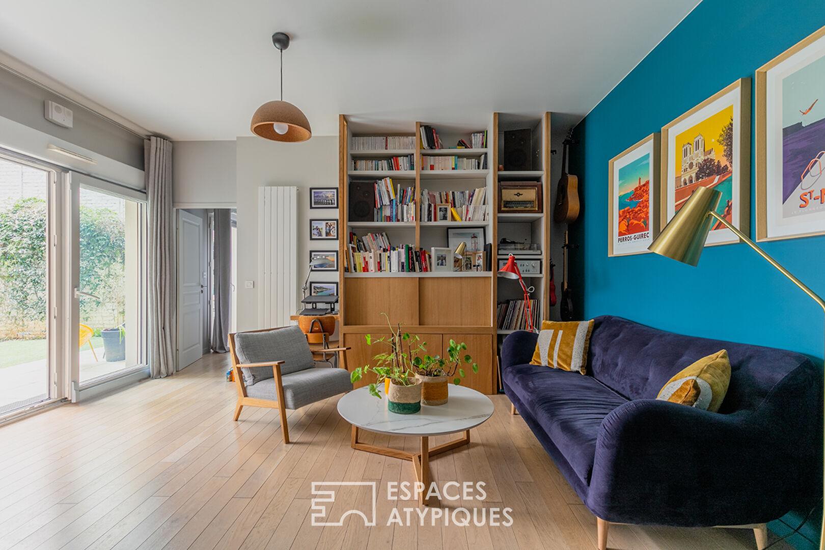 La pièce de vie de 25 m² unit un salon confortable et une cuisine ouverte aux finitions soignées. Ici, l’intervention d’un menuisier a permis de sculpter l’espace : des meubles sur mesure, aux lignes graphiques, optimisent chaque mètre carré tout en apportant une chaleur boisée.
