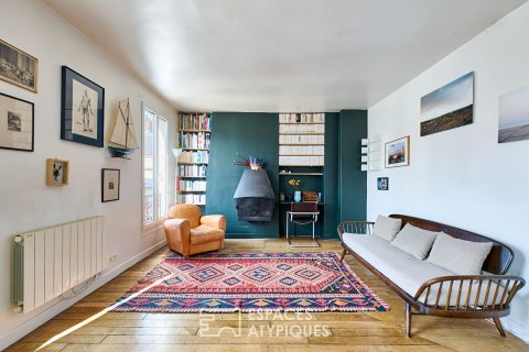 Les quatre grandes fenêtres exposées Ouest sans vis-à-vis, et une cheminée en métal au style moderniste, confèrent à l’ensemble une atmosphère singulière et chaleureuse.