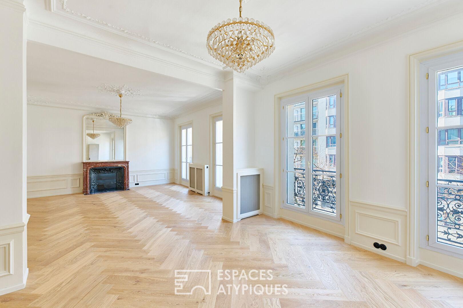 La pièce de vie, véritable coeur de l’appartement, déploie un double séjour de 44,4 m², baigné de lumière grâce à ses quatre grandes fenêtres exposées plein ouest dont deux ouvrent sur le balcon.