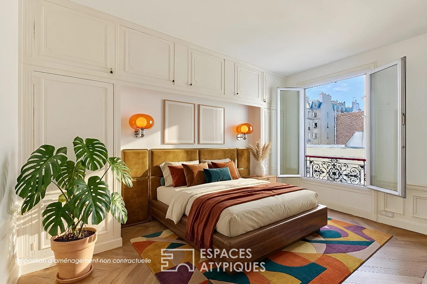 Au coeur du quartier dynamique de Marx Dormoy, au deuxième étage sans ascenseur d’un bel immeuble haussmannien bien entretenu, aux parties communes soignées, cet appartement de 104,16 m² Loi Carrez avec balcon de 3,3 m² a bénéficié d’une rénovation contemporaine de goût, alliant cachet historique et confort actuel.