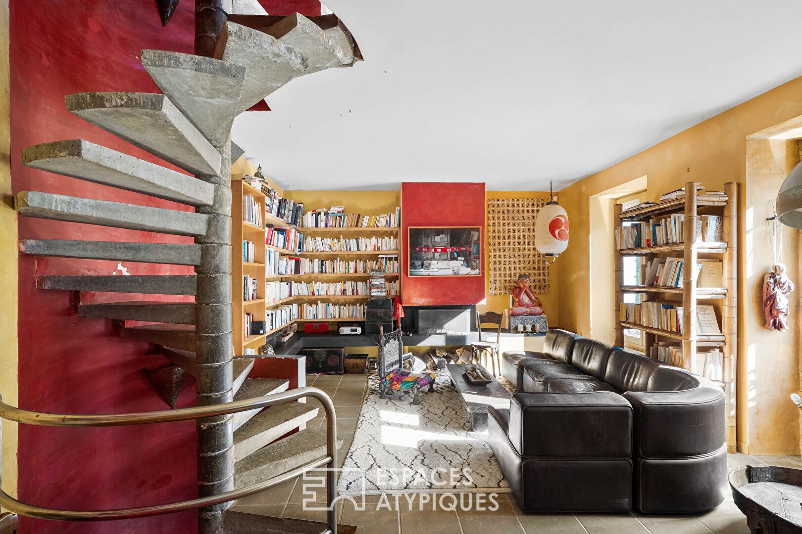 Un superbe double escalier ancien, à la personnalité graphique et affirmée, structure les différents niveaux comme une colonne vertébrale historique, soulignant le caractère unique de cette composition architecturale.