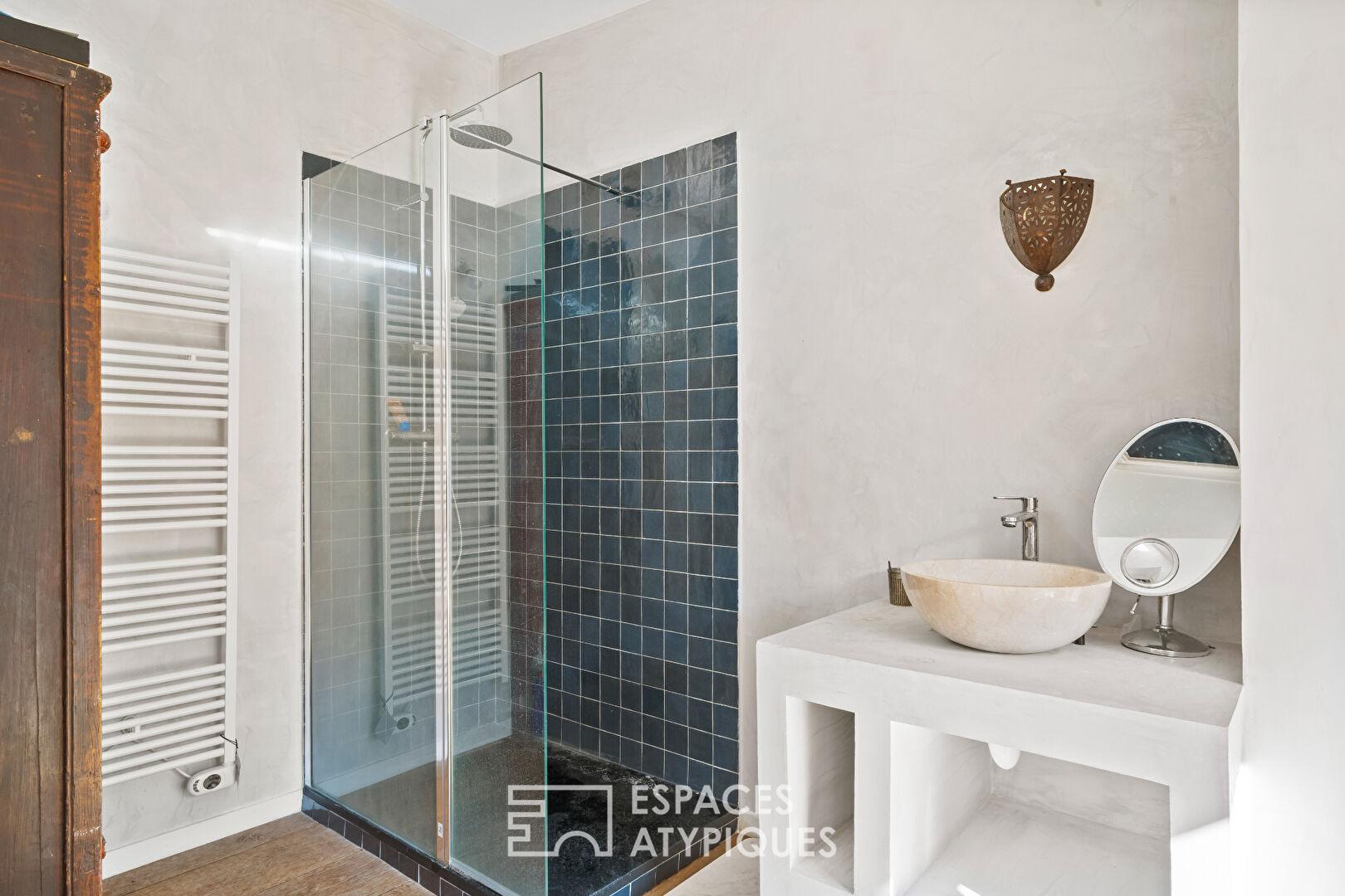 Le rez-de-jardin accueille une première chambre intime avec sa salle de bains, des toilettes, idéale pour recevoir ou s’isoler dans un cocon de sérénité, en prise directe avec la nature.