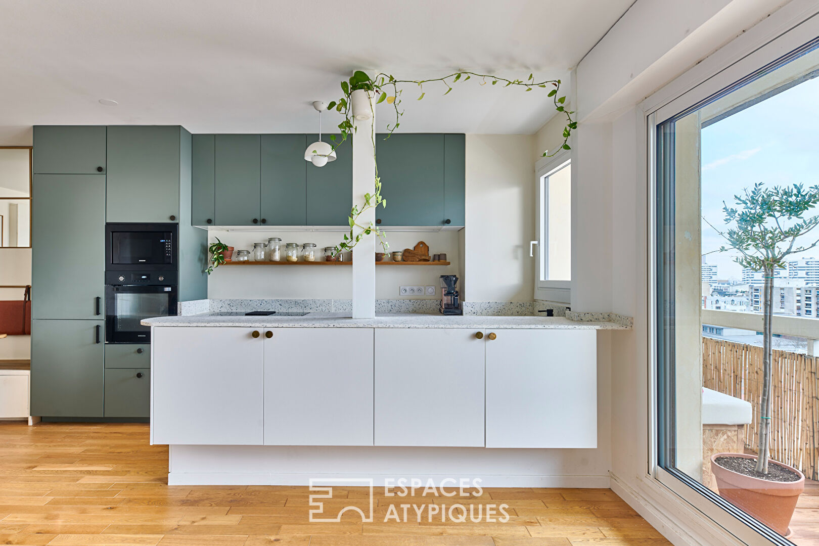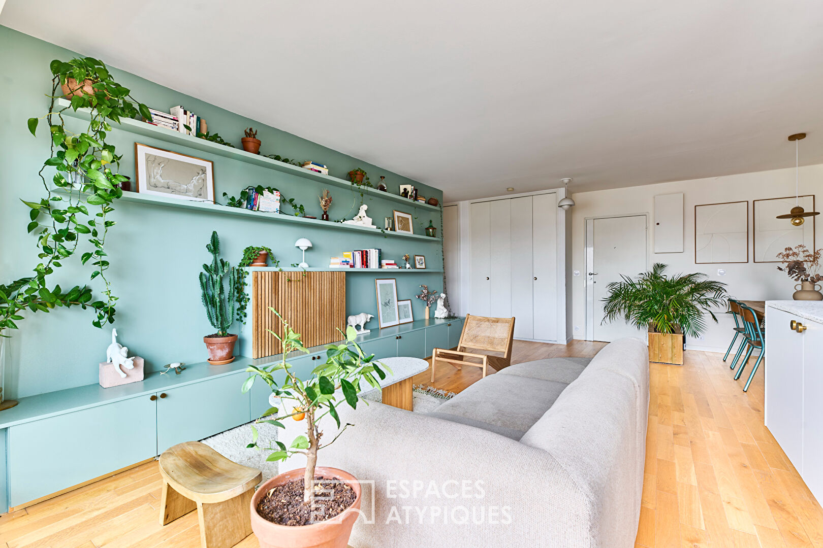 L’entrée ouvre sur le séjour et la cuisine avec un espace salle à manger à l’esprit bohème. Des aménagements astucieux ont été réalisés pour prolonger aux beaux jours la pièce de vie sur le balcon de 5,13m2.