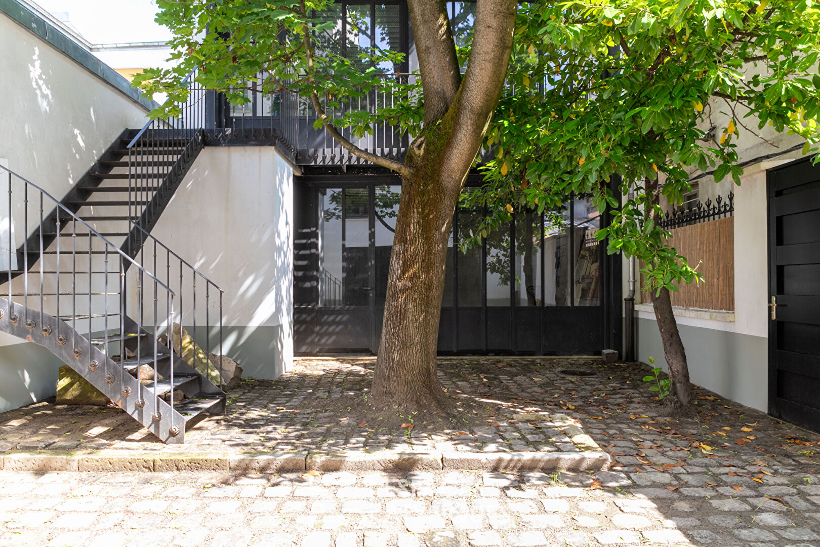Entre le village Jourdain et les buttes Chaumont, au coeur d’un passage à l’abri des regards, deux maisons cachées se faisant face, d’un total de 193m² au sol autour d’une cour de 60m².