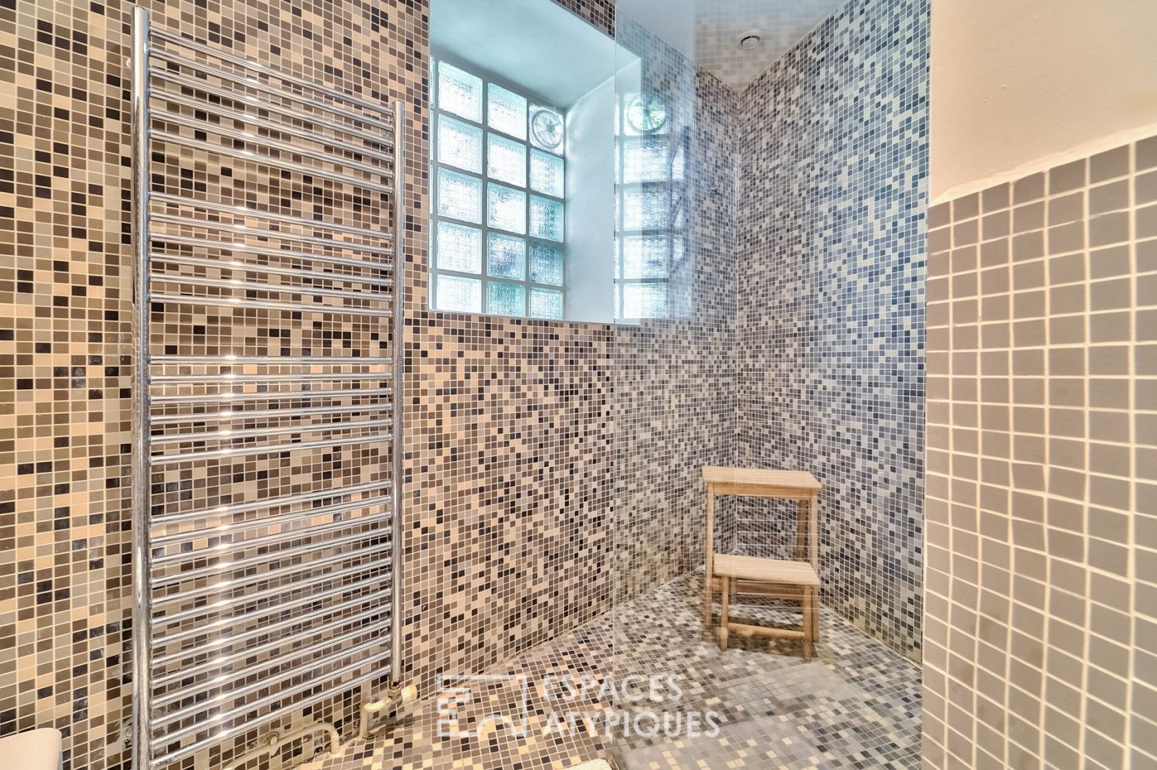 Surplombant l’ensemble, une mezzanine accueille une chambre mansardée avec poutres apparente, accompagnée d’une salle d’eau, puis un espace de travail ou couchage d’appoint.