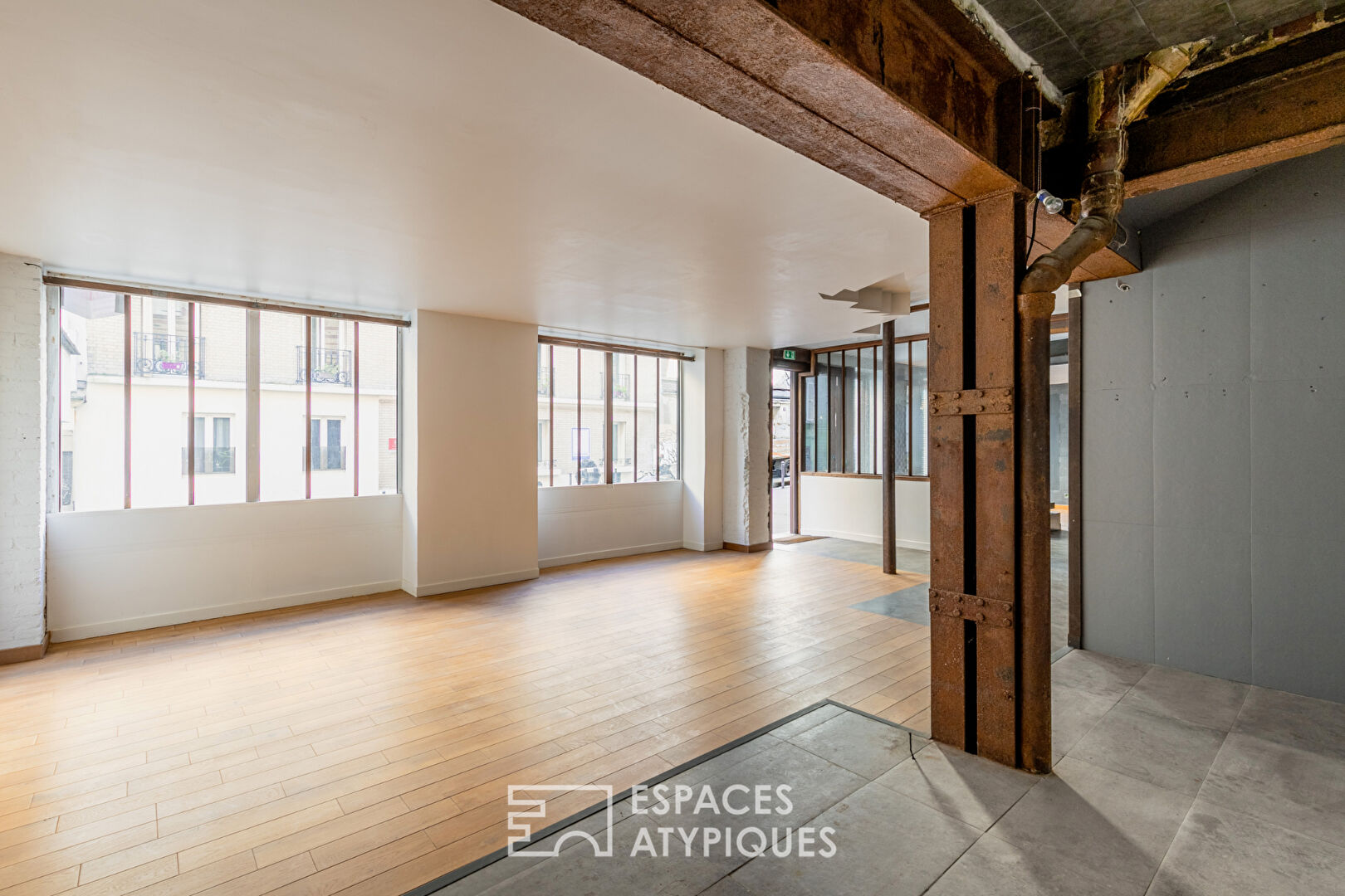 Derrière une façade aux verrières d’atelier, deux accès indépendants depuis la rue mènent à un espace de 85 m², baigné de lumière grâce à ses larges ouvertures. Le parquet massif associé aux poutres métalliques apparentes, confère à ce lieu une ambiance industrielle et authentique.