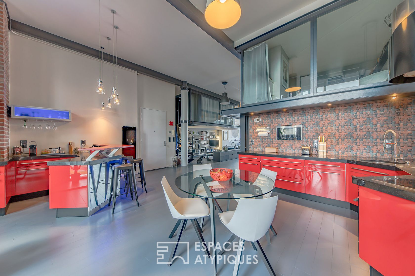 Tous les codes du loft sont présents, des murs en briques, aux poutres métalliques en passant par les mezzanines surplombant le séjour. La cuisine d’environ 30 m² aux tons rouges vifs se divise en deux parties.