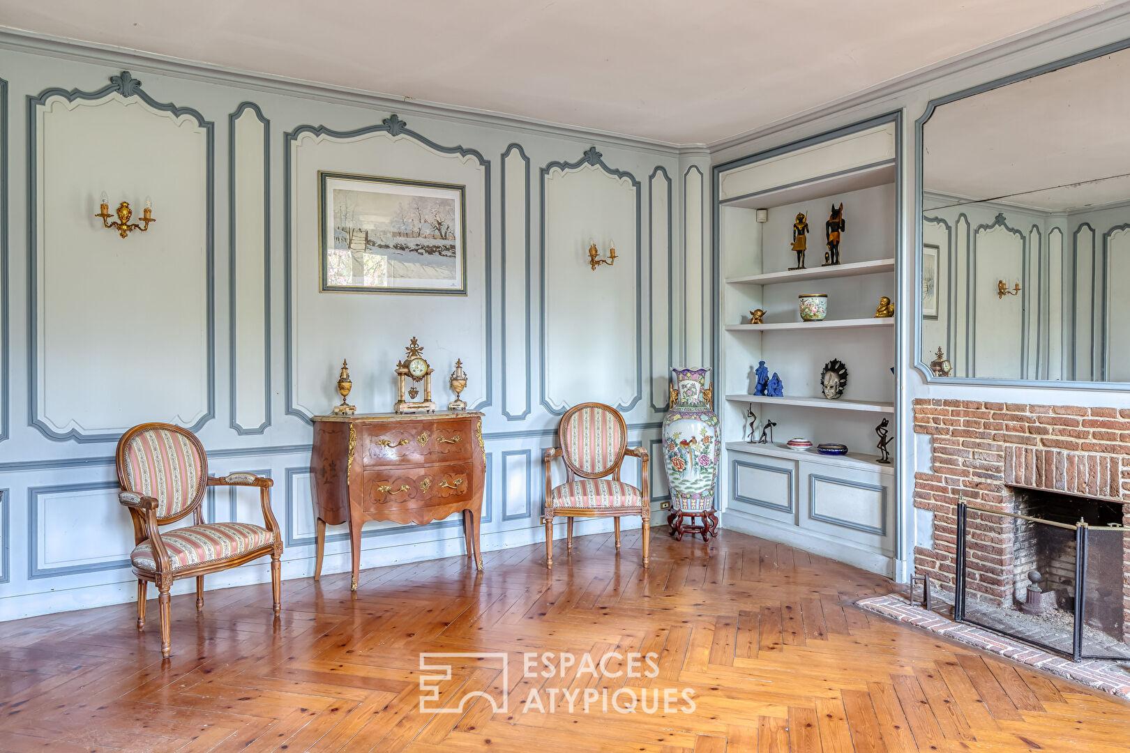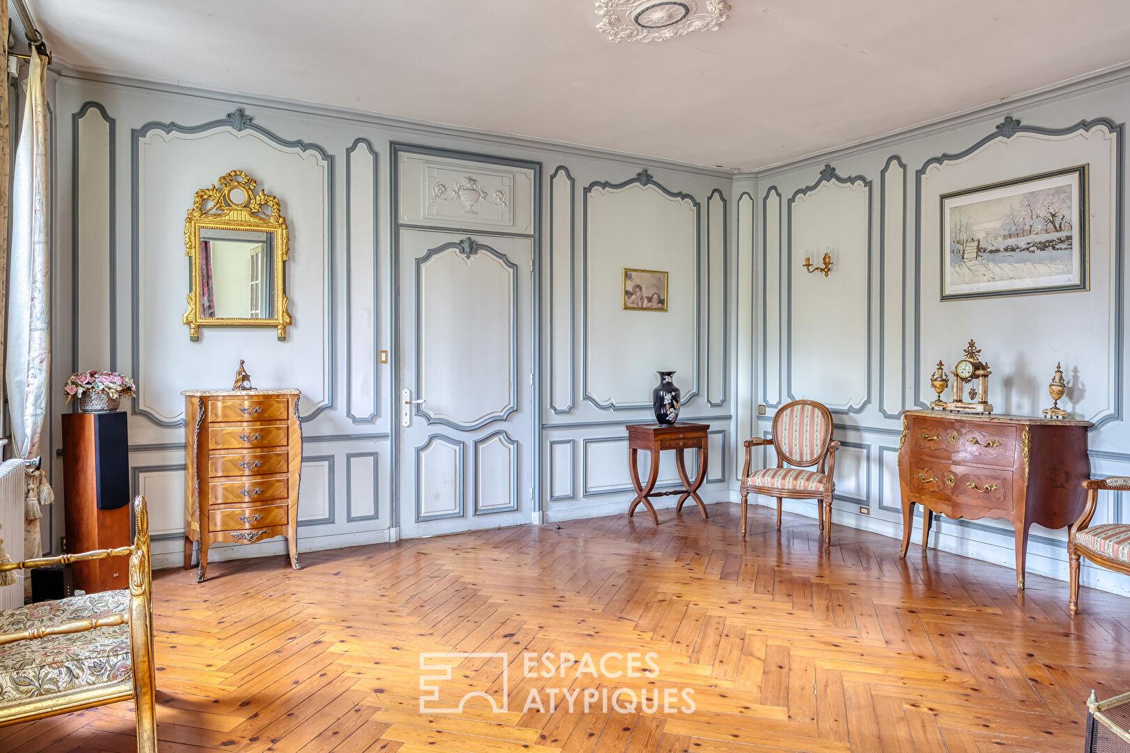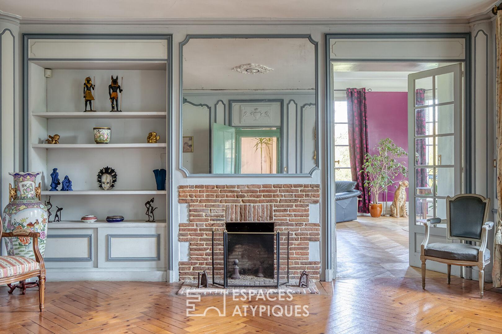 L’aile dédiée à la réception s’ouvre sur un salon intimiste de 22 m², où la chaleur d’un parquet massif en bâtons rompus répond au caractère d’une cheminée en briques.