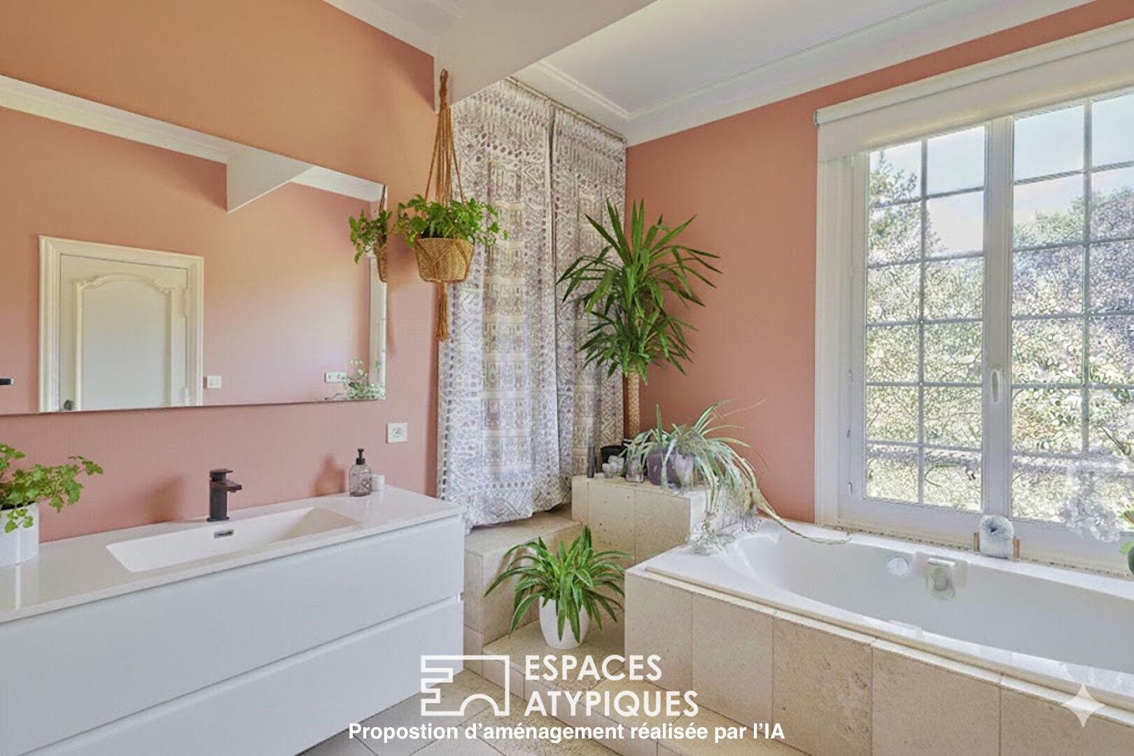 Le premier étage dévoile une master suite d’exception, baignée de lumière. Véritable sanctuaire de bien-être, sa salle de bains privative invite à la contemplation : la baignoire offre une vue plongeante et spectaculaire sur la canopée du parc, transformant chaque instant en une parenthèse hors du temps.