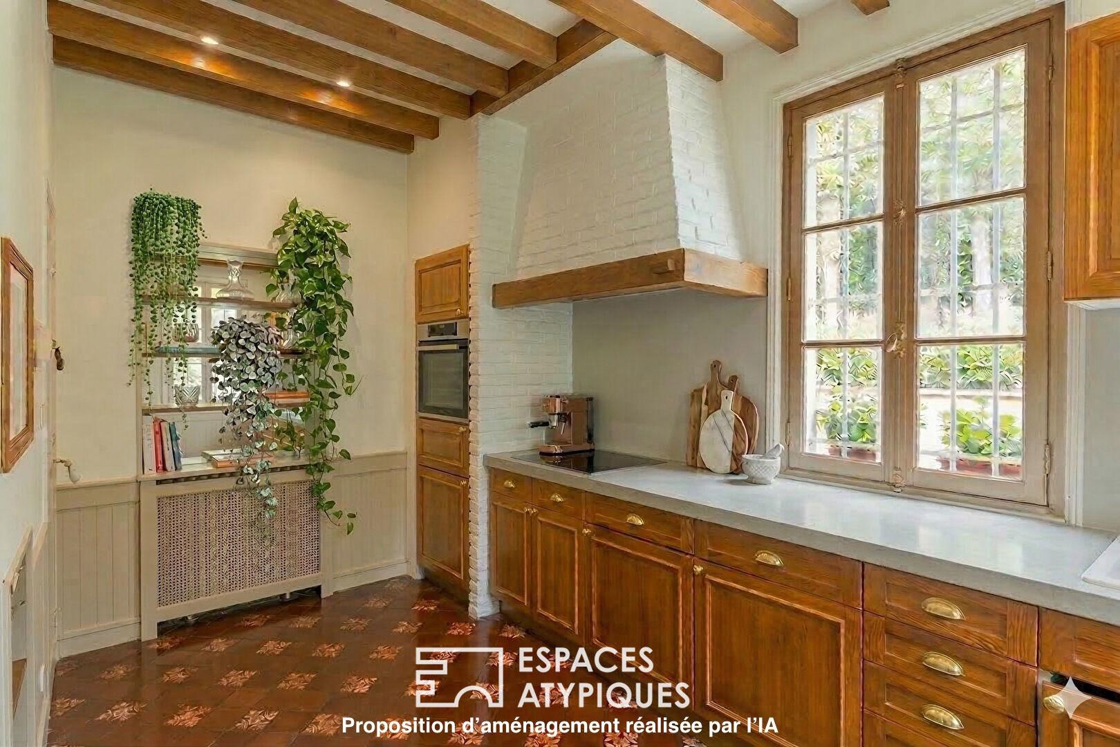 L’aile opposée, dédiée à la convivialité, dévoile une salle à manger de caractère au sol patiné, s’ouvrant en continuité sur l’espace cuisine.