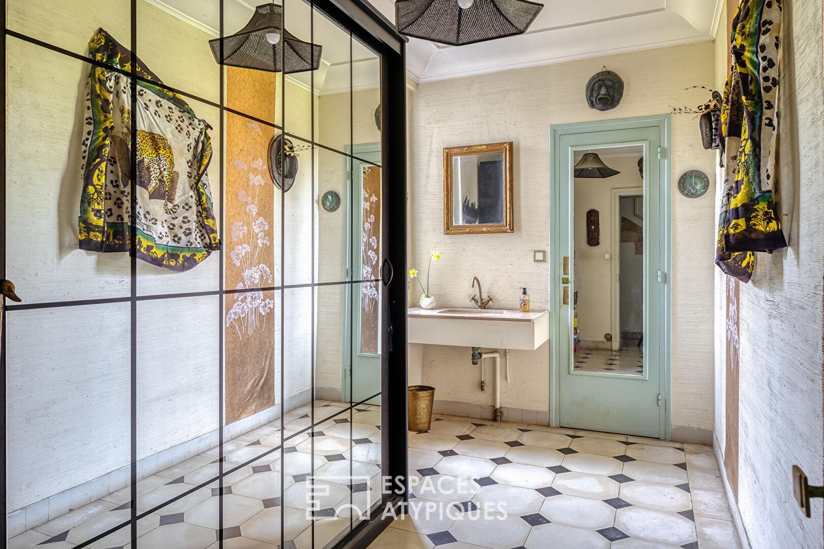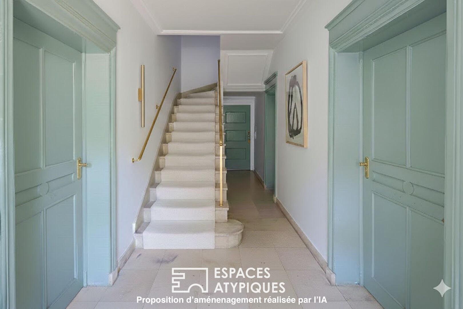 Dès le hall d’entrée, le ton est donné par l’élégance minérale d’un sol en travertin, véritable trait d’union entre les différentes ailes de la demeure.
