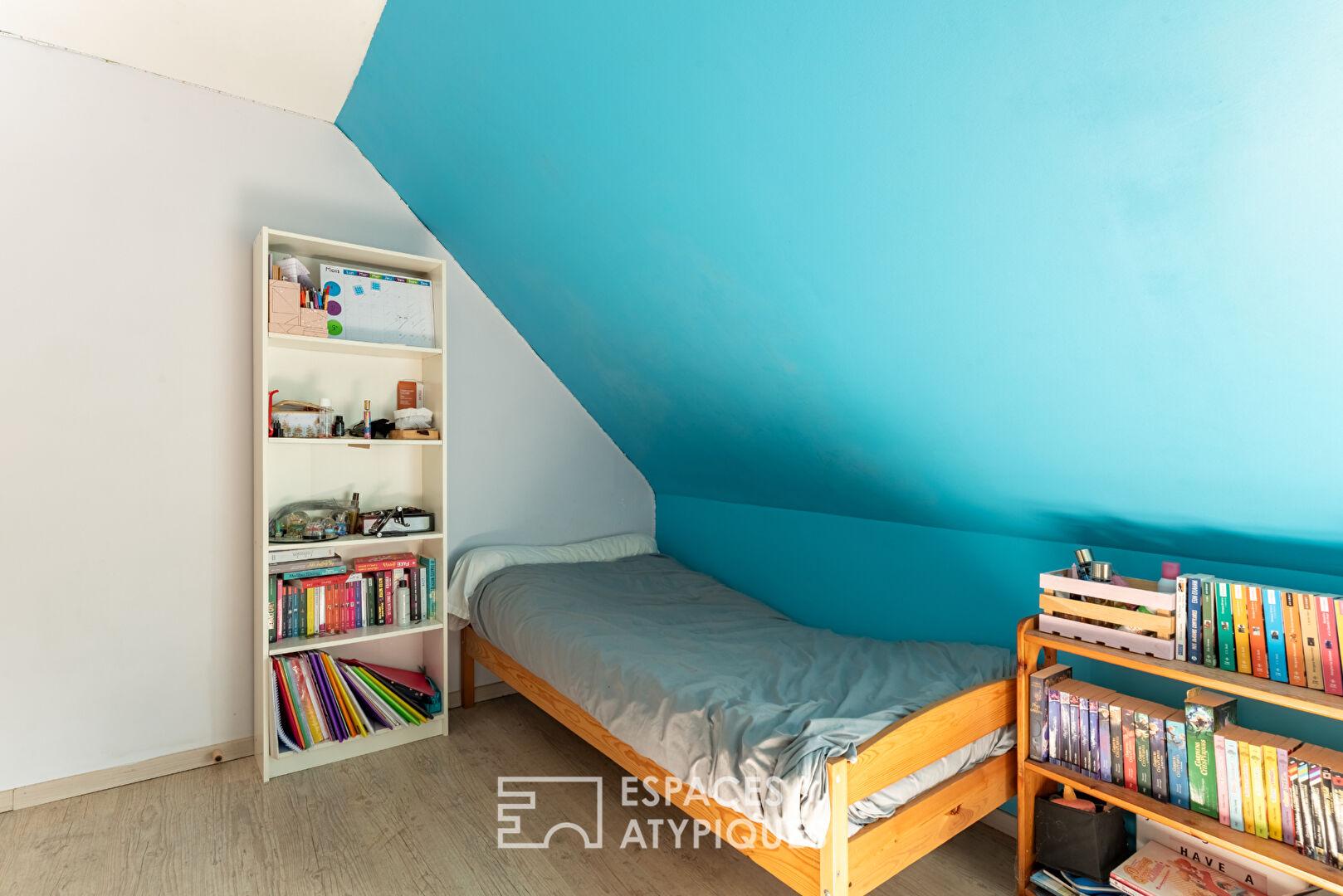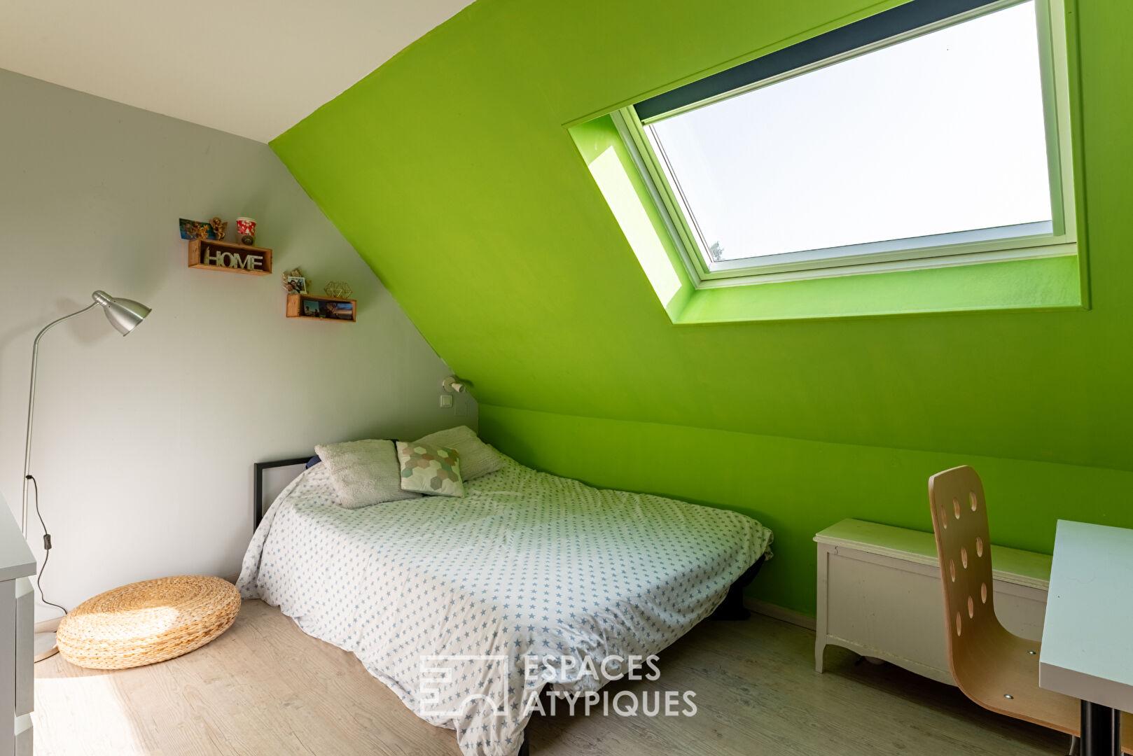 À l’étage, l’espace nuit accueille quatre chambres ainsi qu’un coin télétravail installé sur le palier.