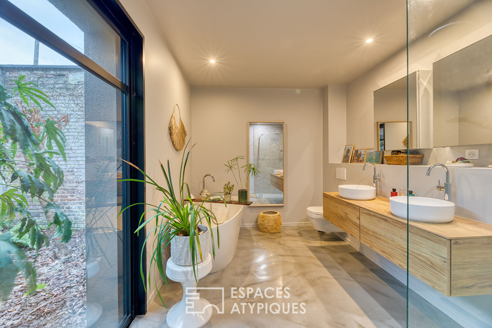 Dès l’entrée, le regard est happé vers le jardin luxuriant et verdoyant, créant ainsi une oasis de calme et de sérénité. Des plantes exotiques et une variété d’arbustes forment un écrin de verdure autour de la propriété.