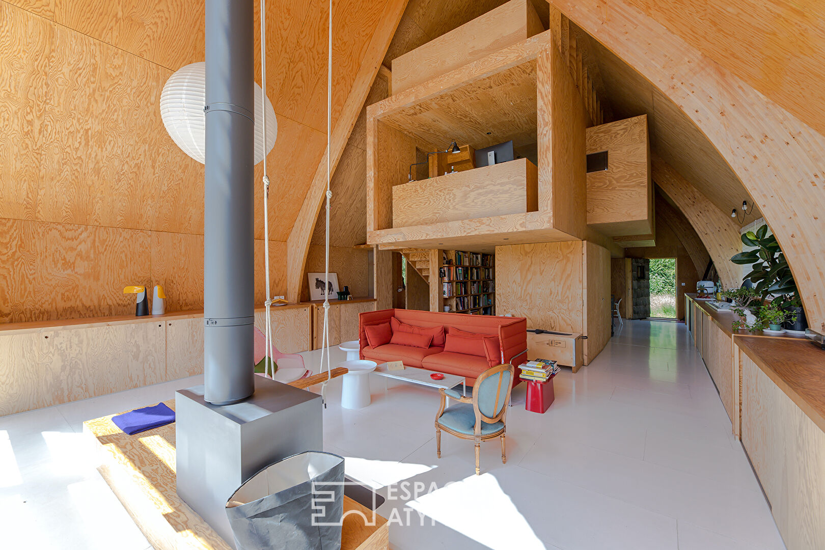 Un espace unique de 180m2, spectaculaire, avec une hauteur sous faîtage de 8 mètres, offre tout d’abord un espace de vie de 100m2, alors que la partie nuit prend place sur deux niveaux supérieurs, dans des « cubes » de bois, comme en lévitation.