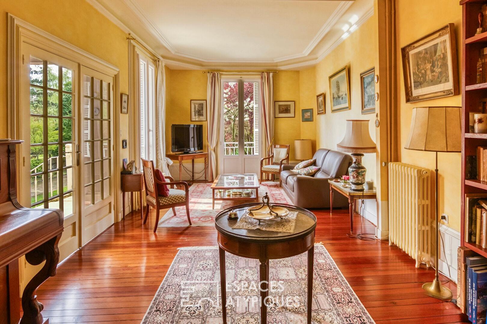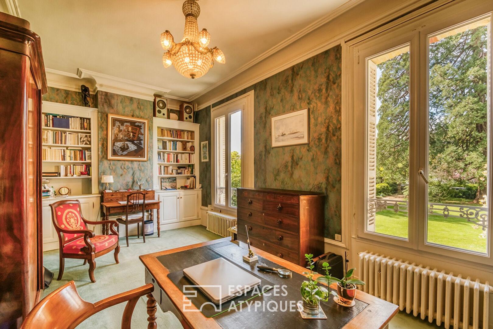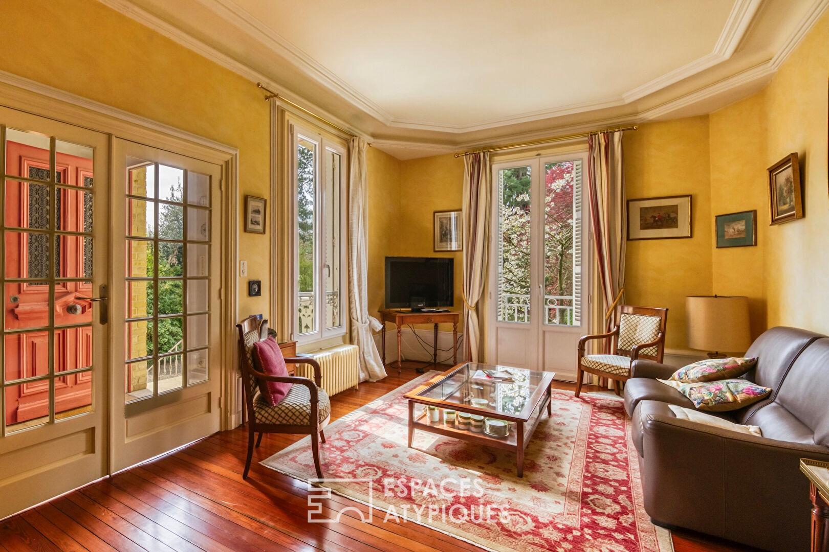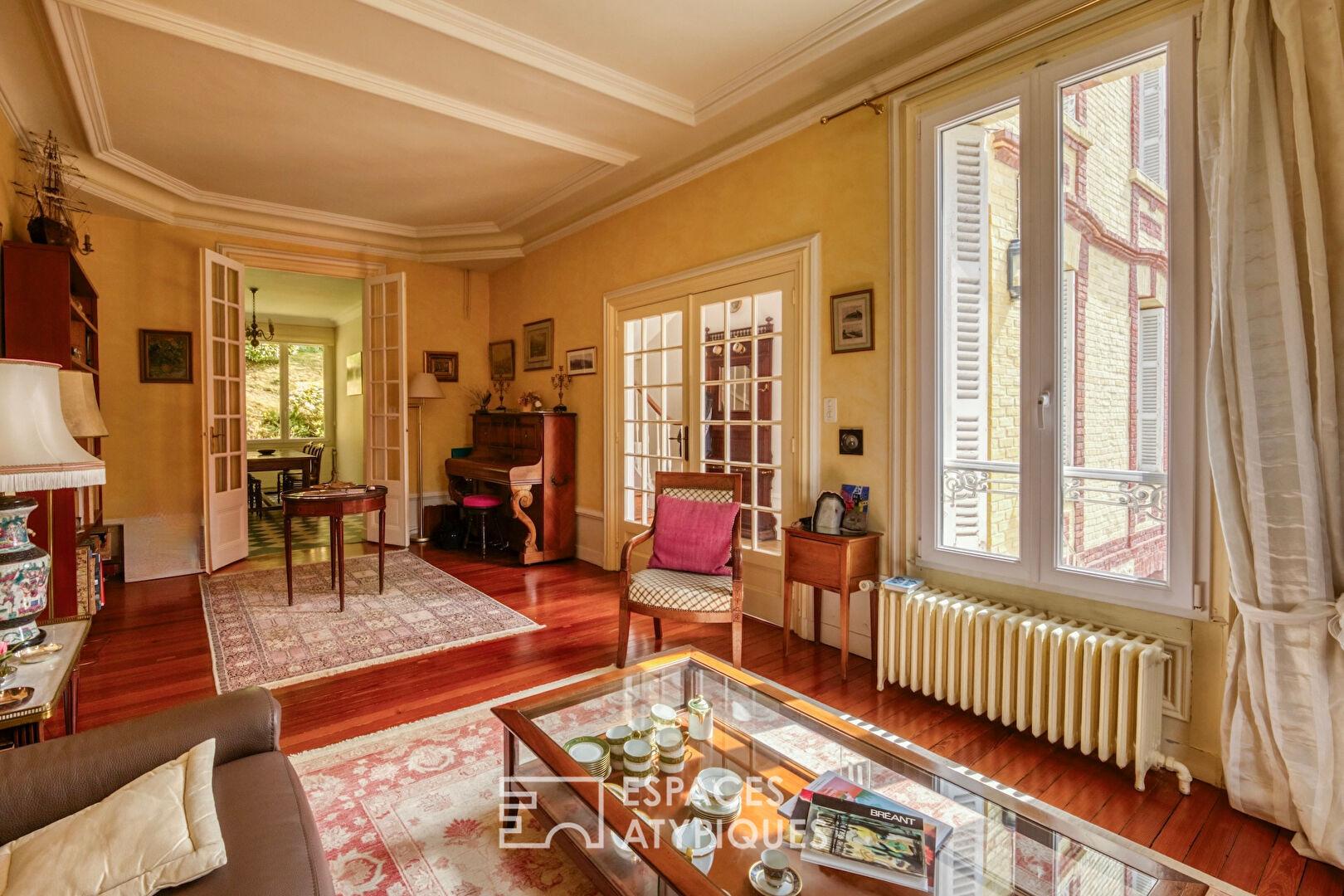 Se révélant discrète et confidentielle, cette villa d’époque ne dévoile sa jolie façade en briques rouges et jaunes qu’au-delà d’un large portail s’ouvrant sur un parc arboré de 1800 m².