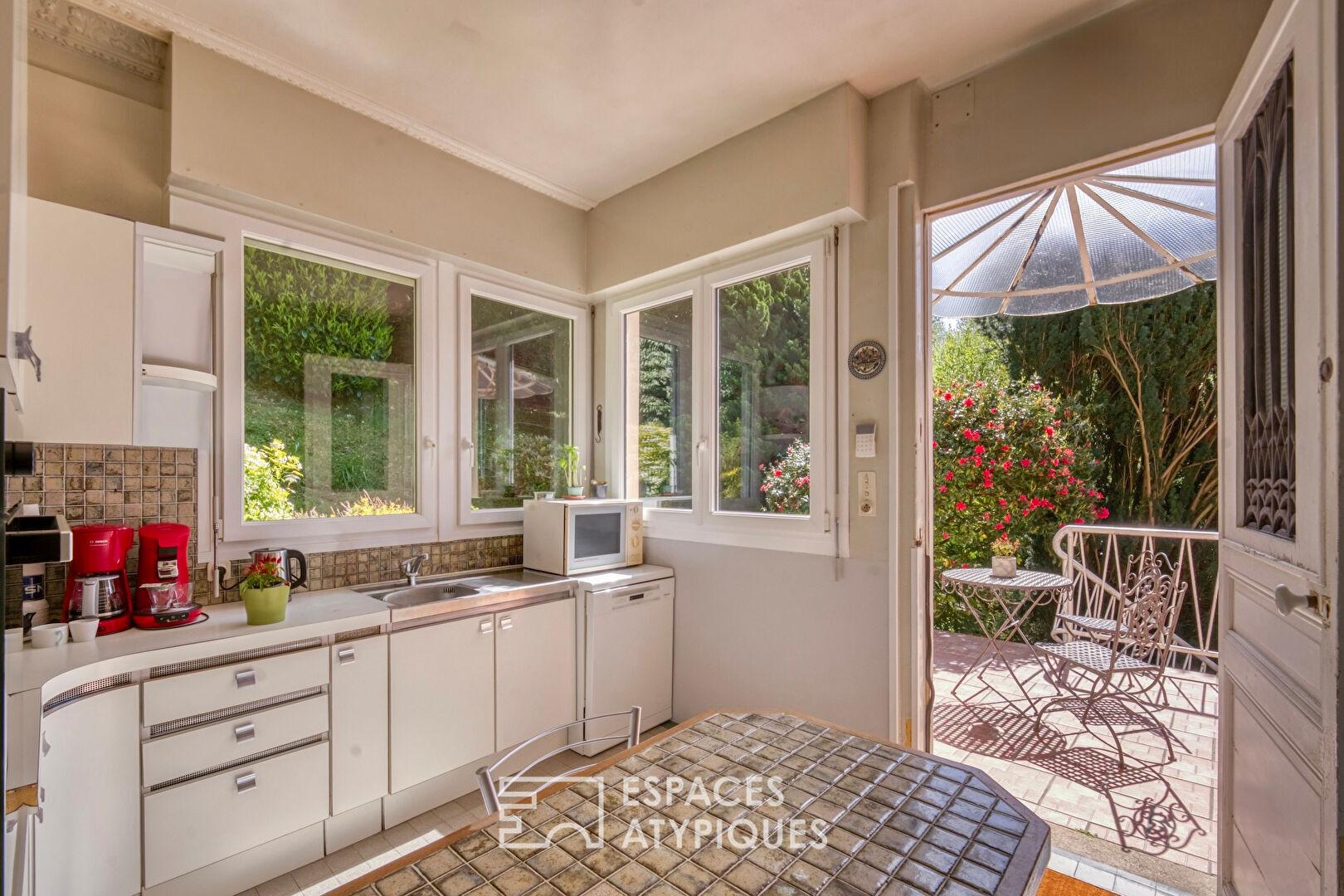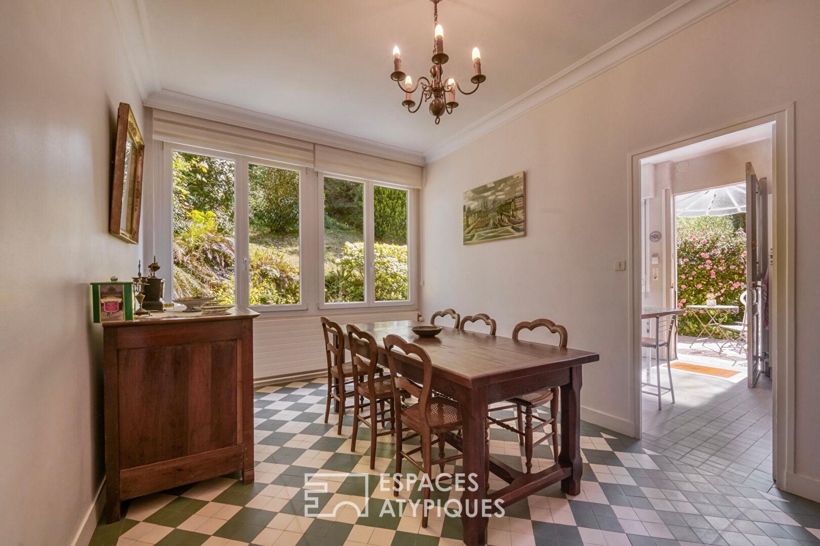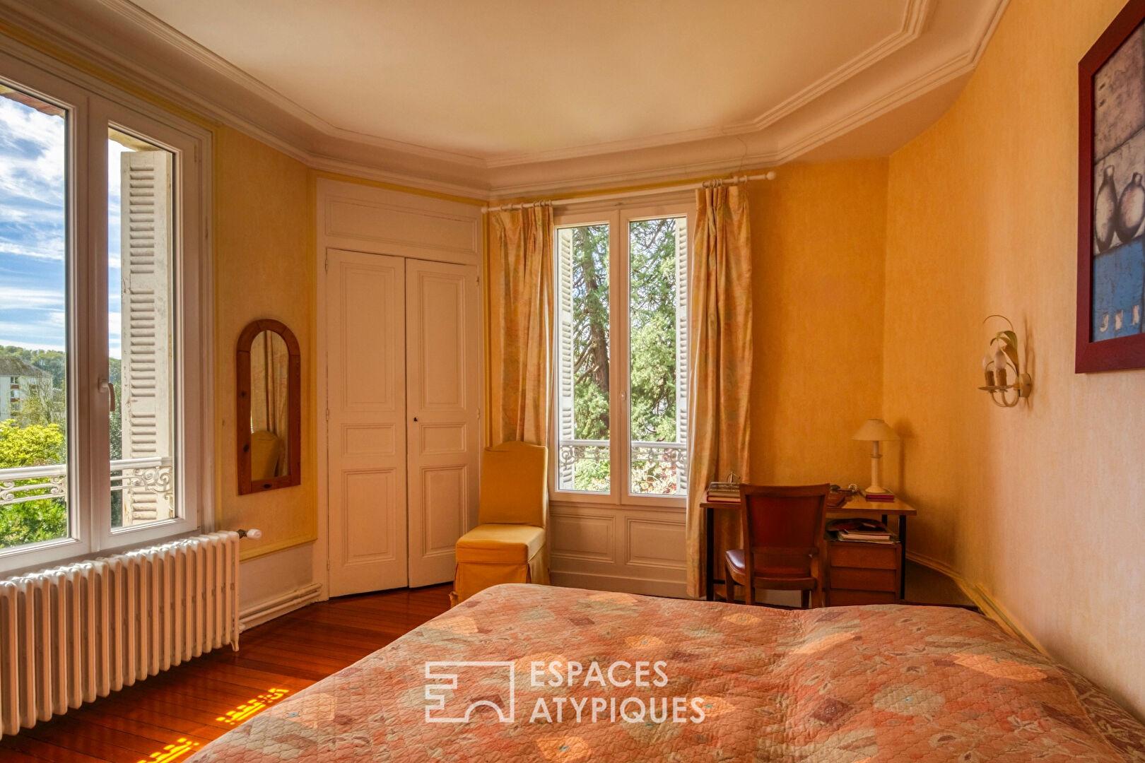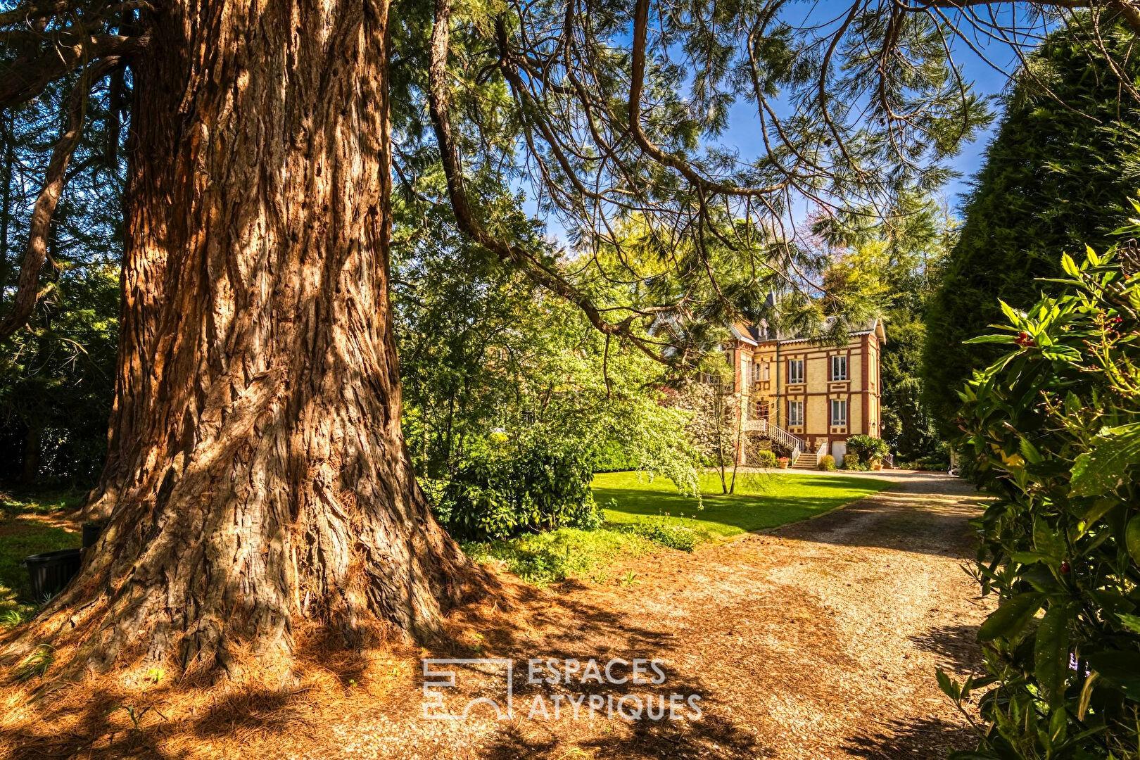 Se révélant discrète et confidentielle, cette villa d’époque ne dévoile sa jolie façade en briques rouges et jaunes qu’au-delà d’un large portail s’ouvrant sur un parc arboré de 1800 m².