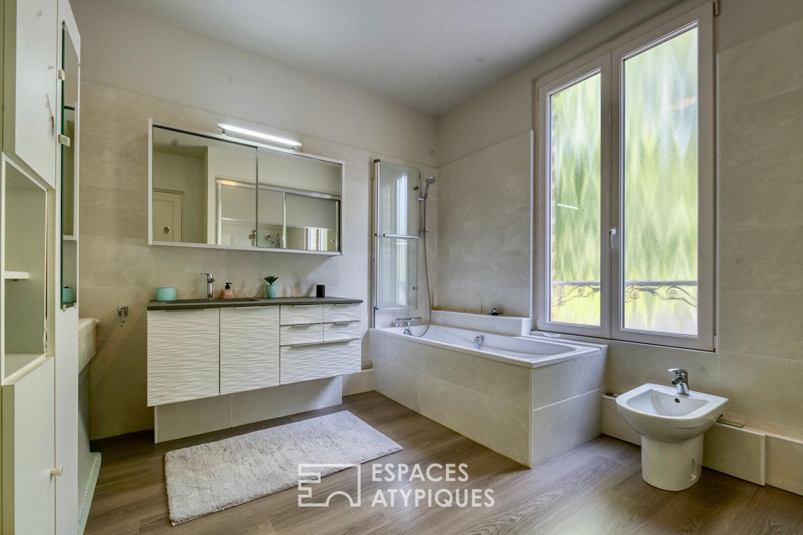 Déployant 170 m² sur trois niveaux, elle offre tout d’abord une belle pièce de réception à la lumière traversante, composée d’un espace salon dominant le parc et d’une salle à manger ayant pour perspective la foisonnante végétation du jardin.