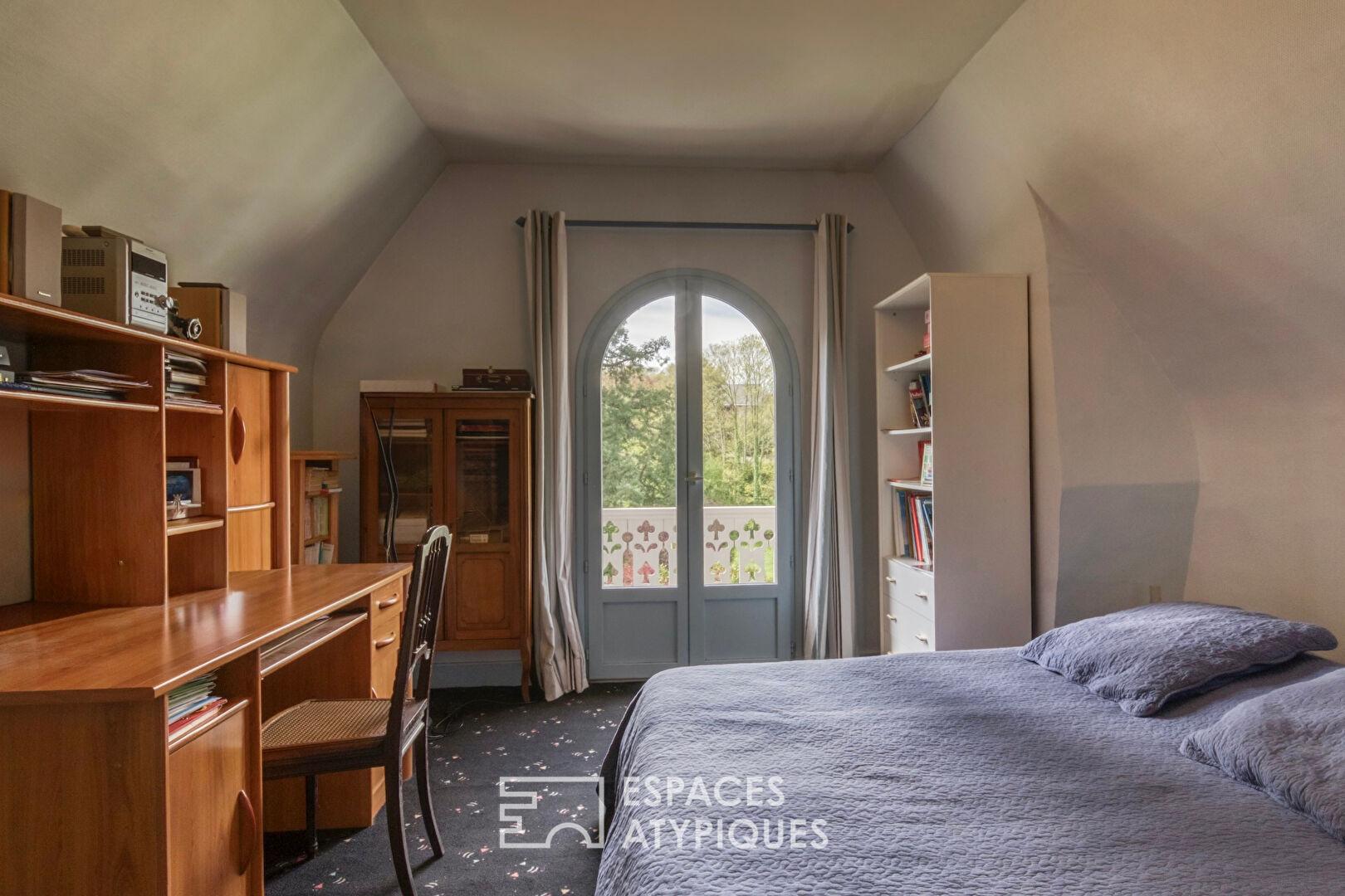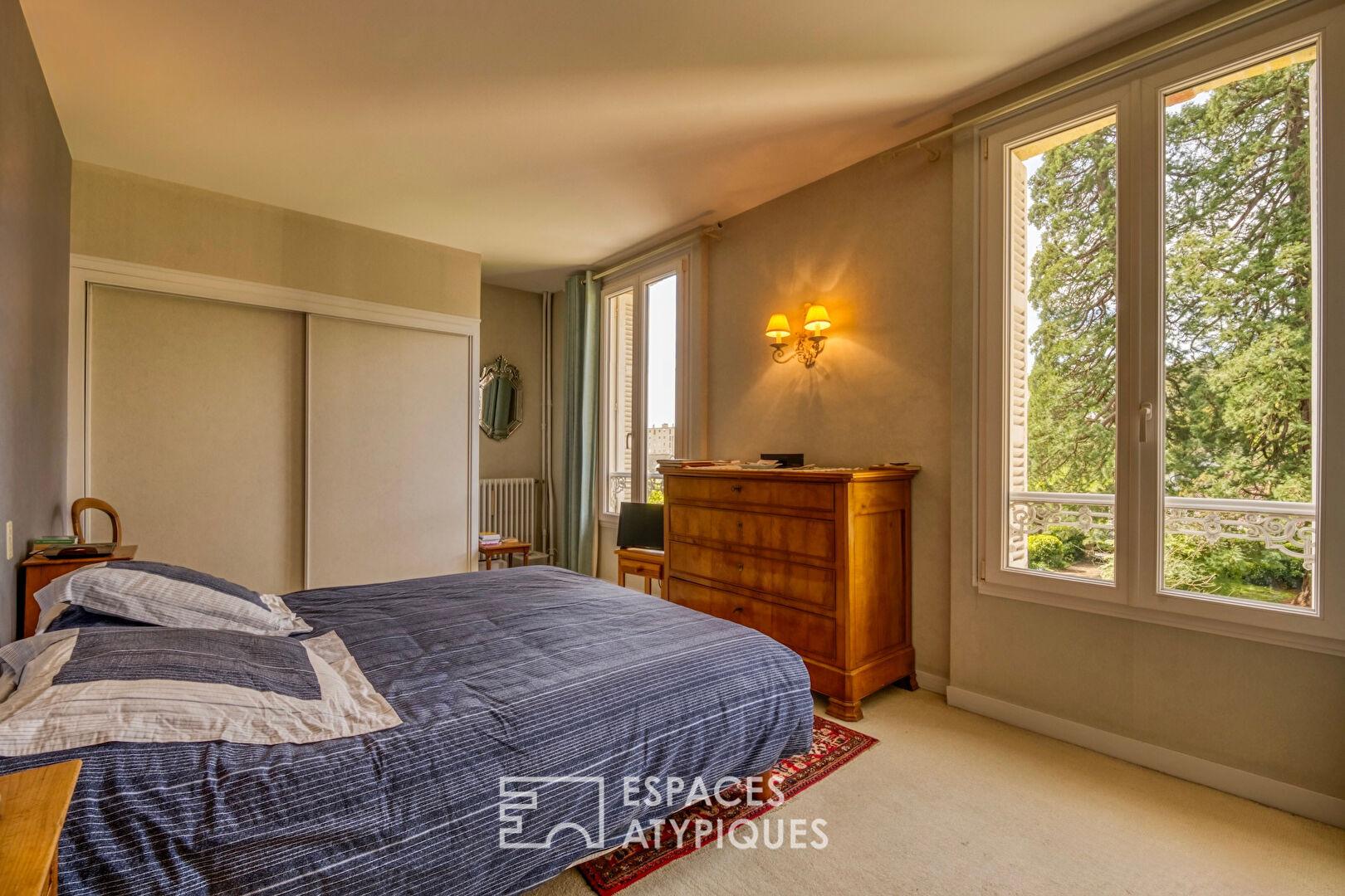 Ce premier niveau est complété par une vaste chambre de près de 20 m², utilisée actuellement en bureau, avec vue sur le parc délimité par les hautes silhouettes d’arbres séculaires.