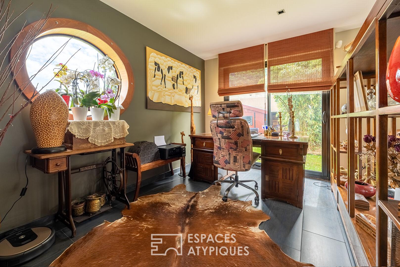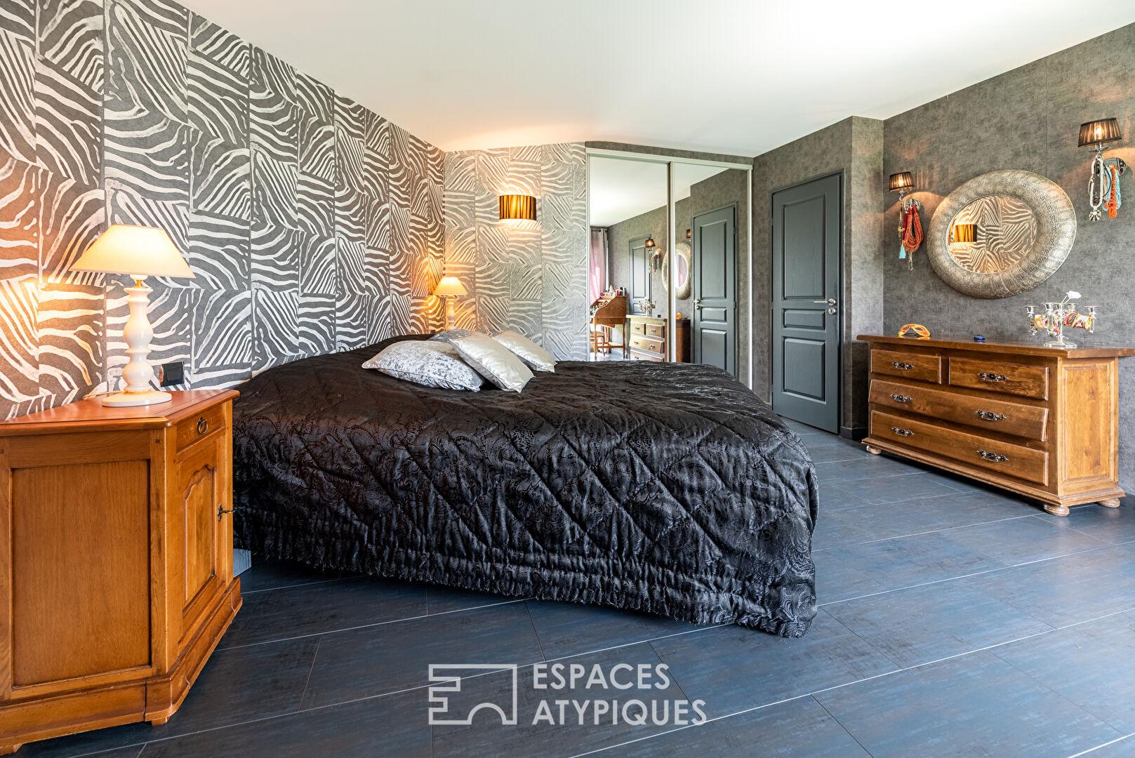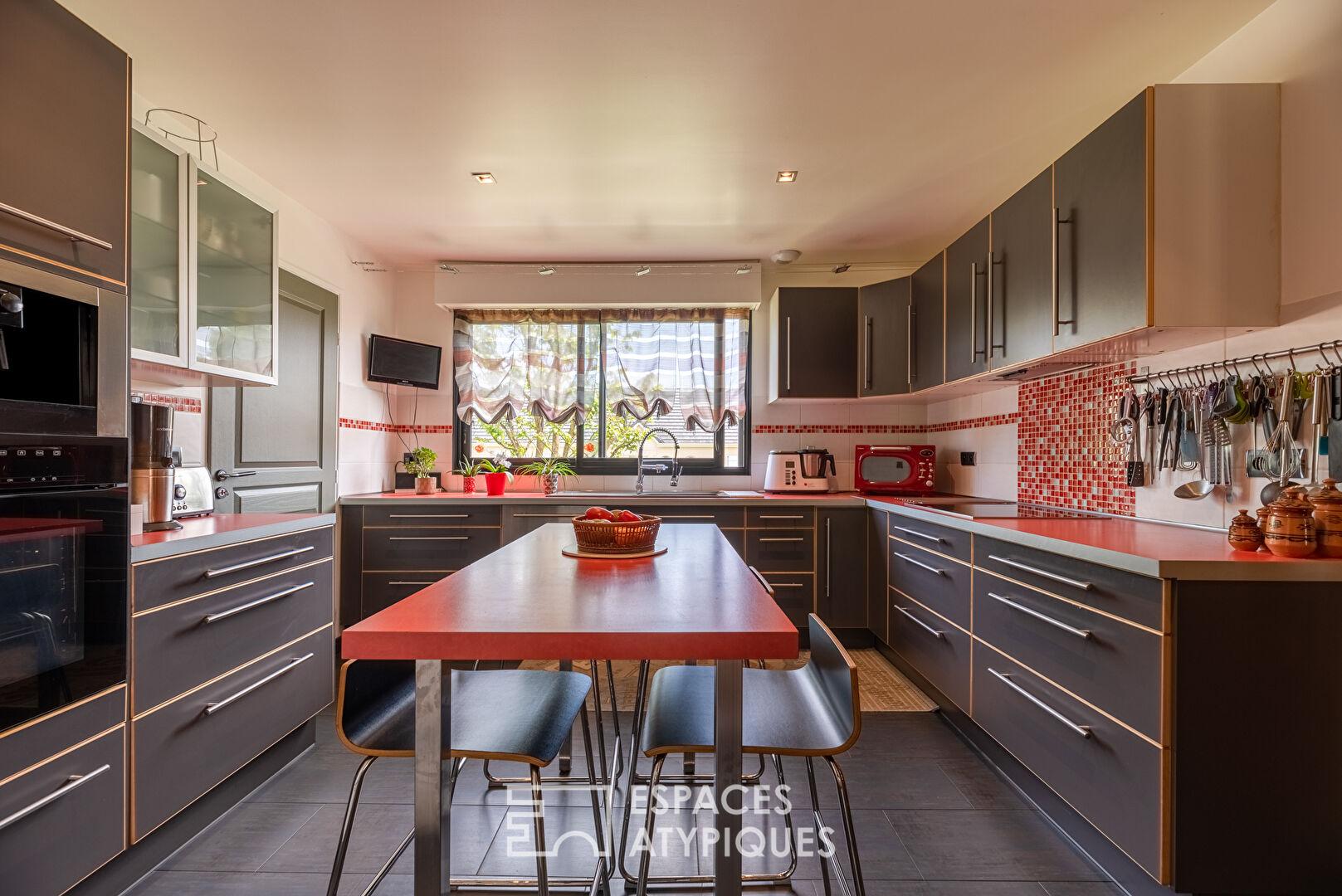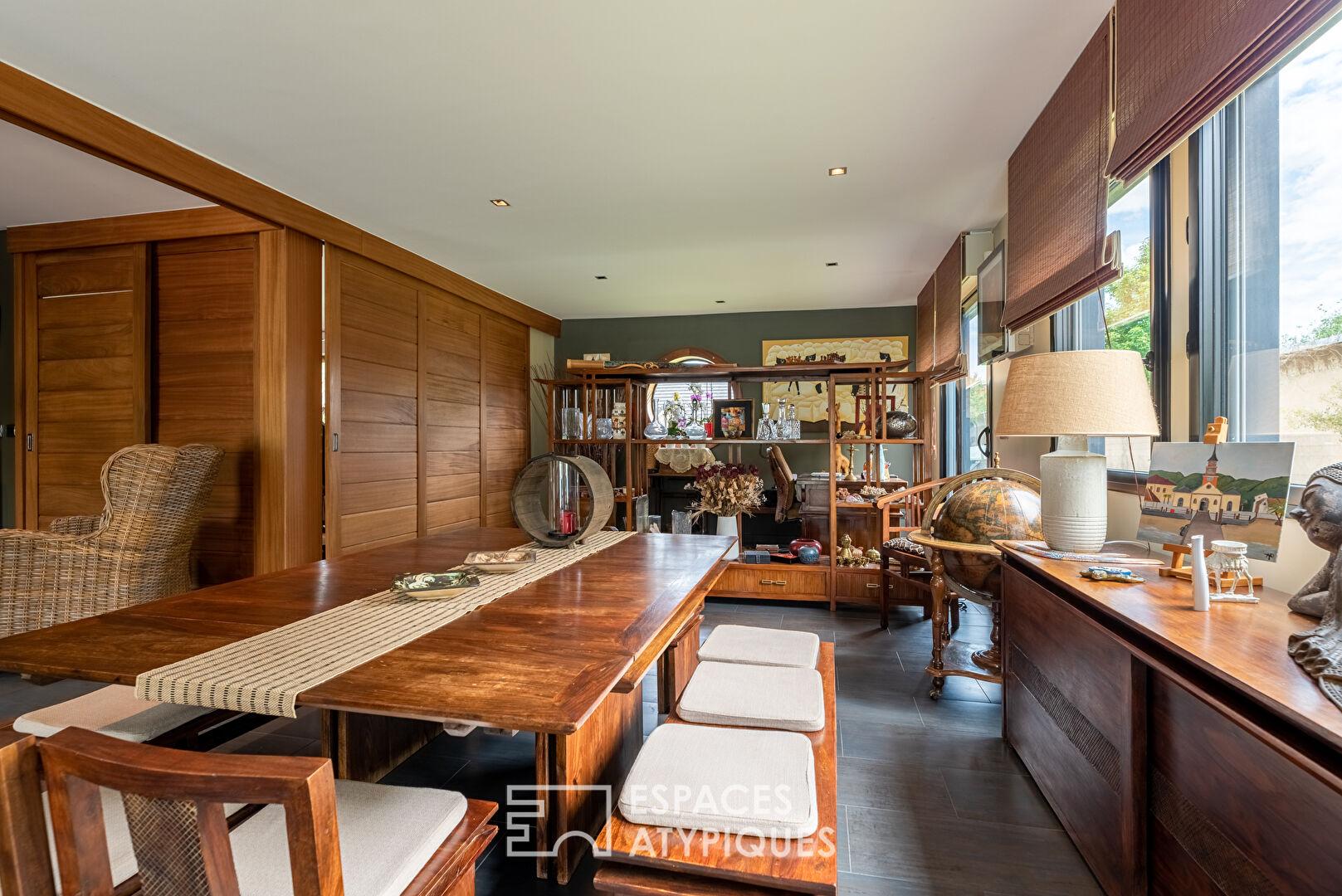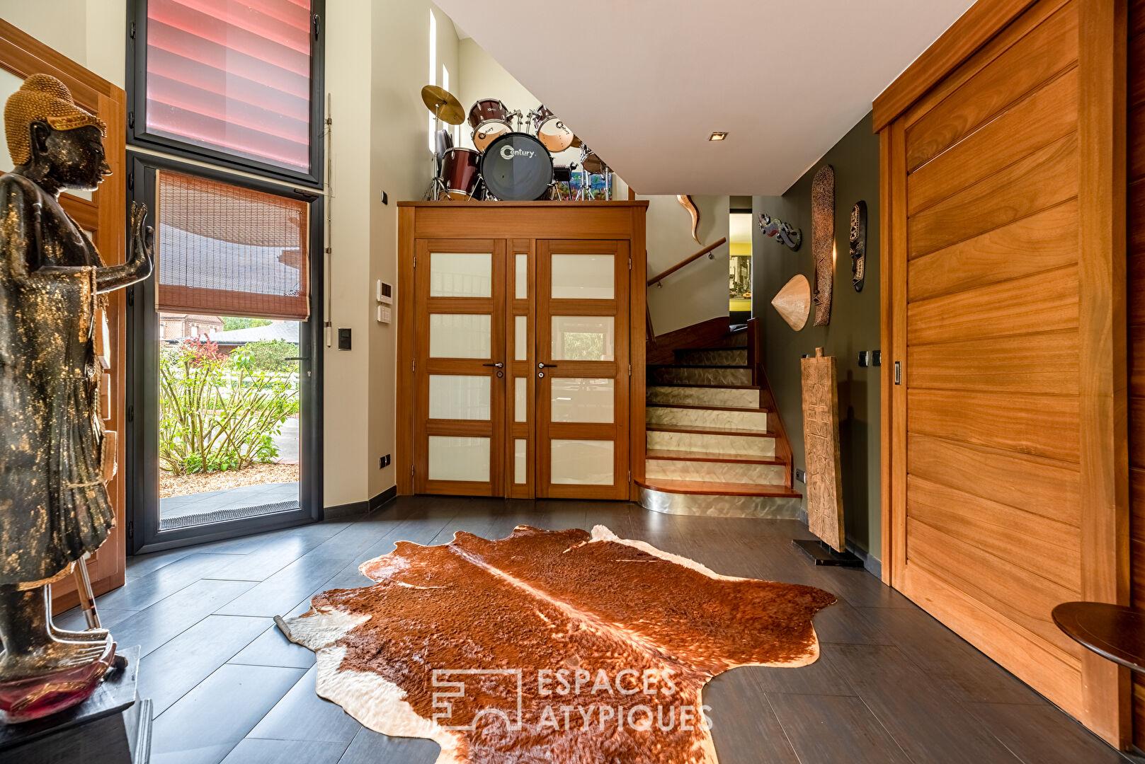 Cette maison d’exception offre des prestations haut de gamme, des volumes généreux et une décoration des plus raffinées tout en s’insérant dans un environnement verdoyant.