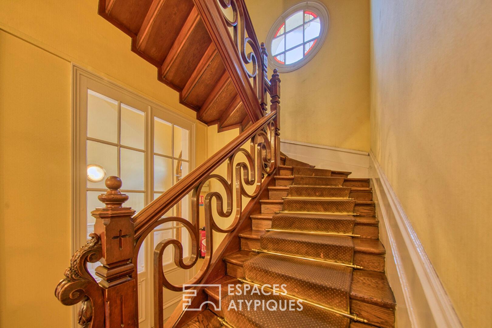 Un confortable escalier rythmé par des balustres en volutes mène aisément à l’appartement.