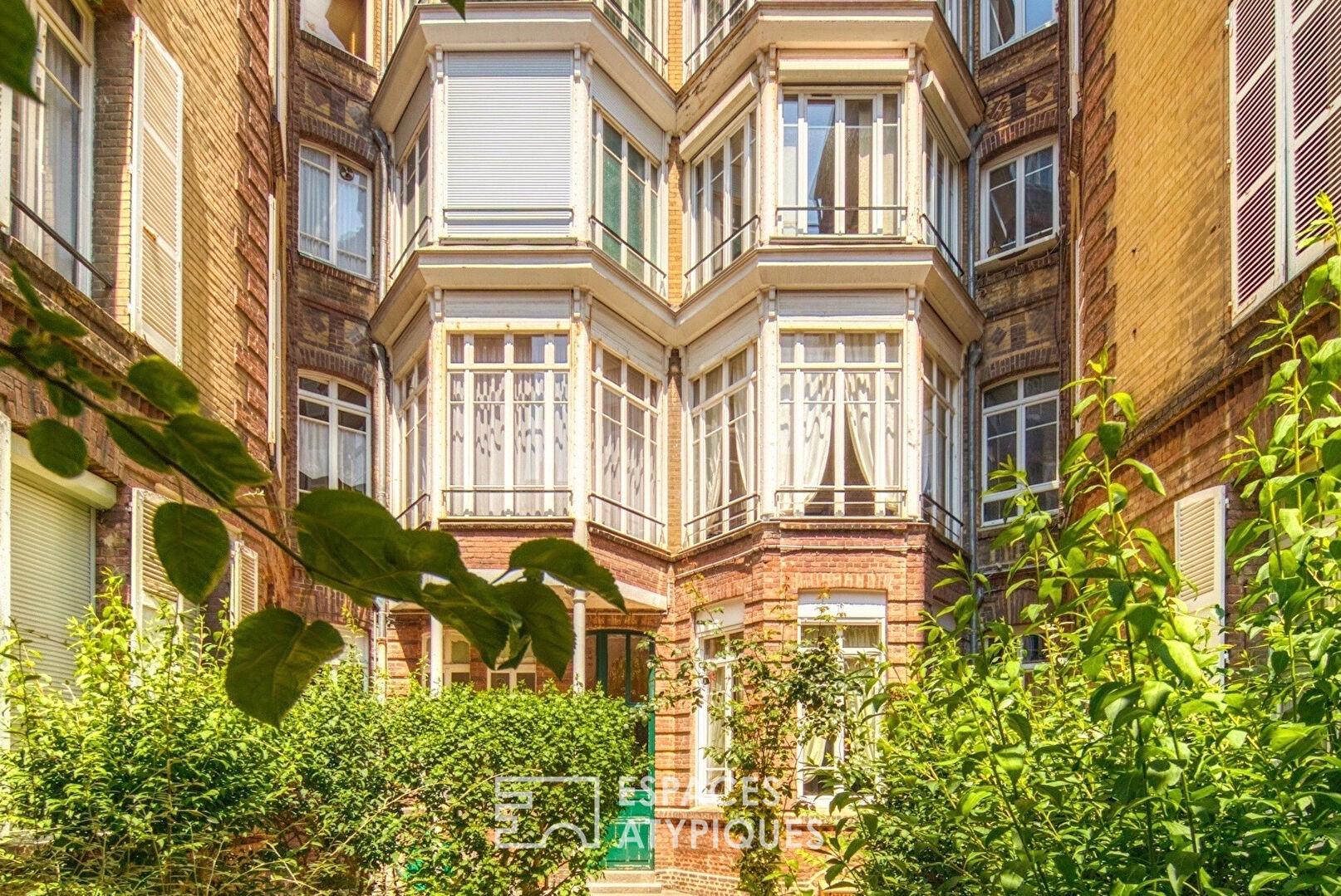 Au pied de la remarquable façade signée par un architecte inspiré du début du siècle dernier, une imposante porte en bois s’ouvre sur un vaste hall donnant accès discrètement à une agréable cour plein sud avec jardin et à un précieux local à vélos, strictement dédiés aux copropriétaires.