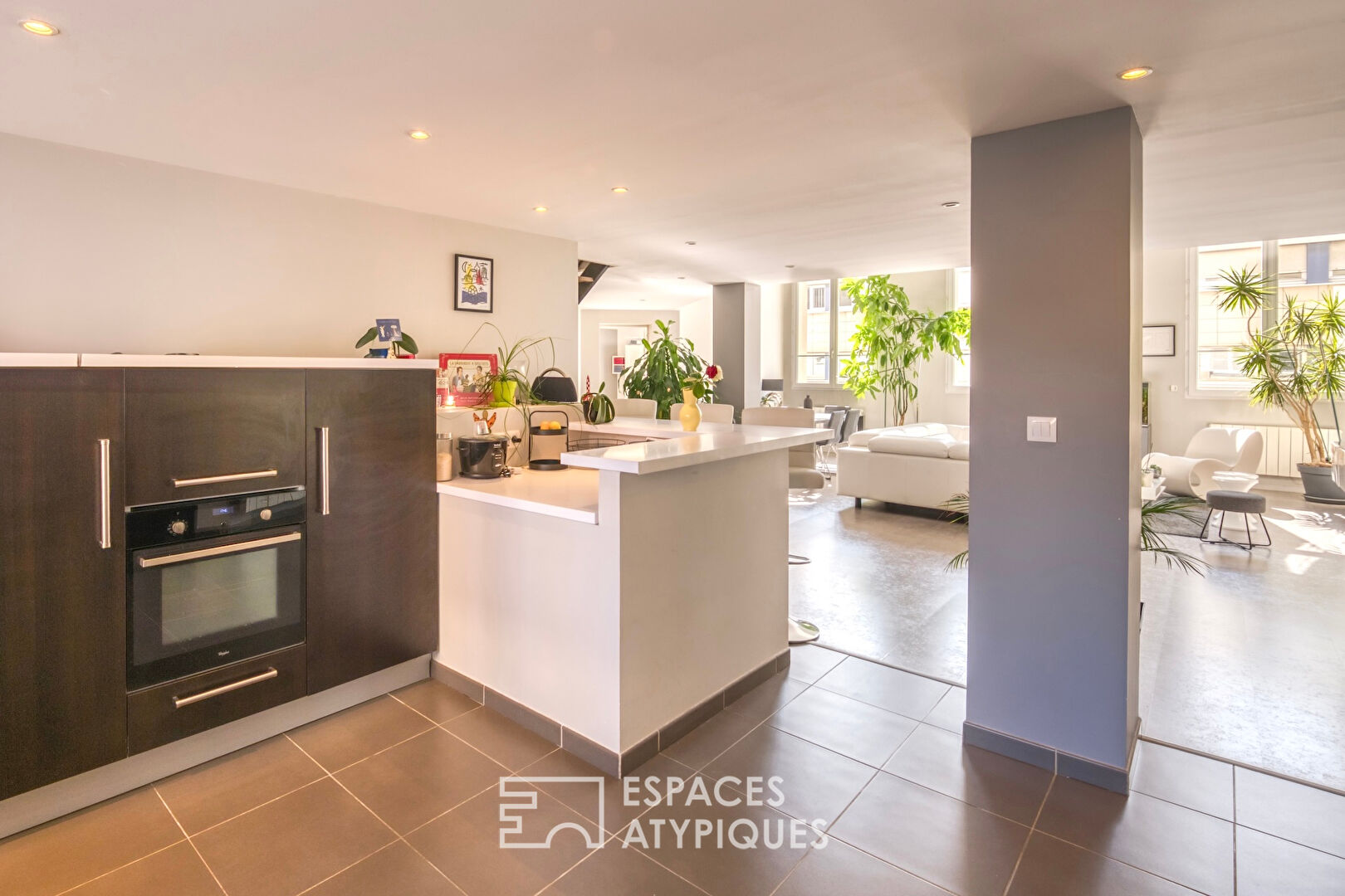 La pièce à vivre de près de 80 m2 se répartit entre une spacieuse cuisine américaine parfaitement équipée et un superbe séjour -salon rythmé par trois hautes fenêtres cintrées, véritables signatures du lieu.