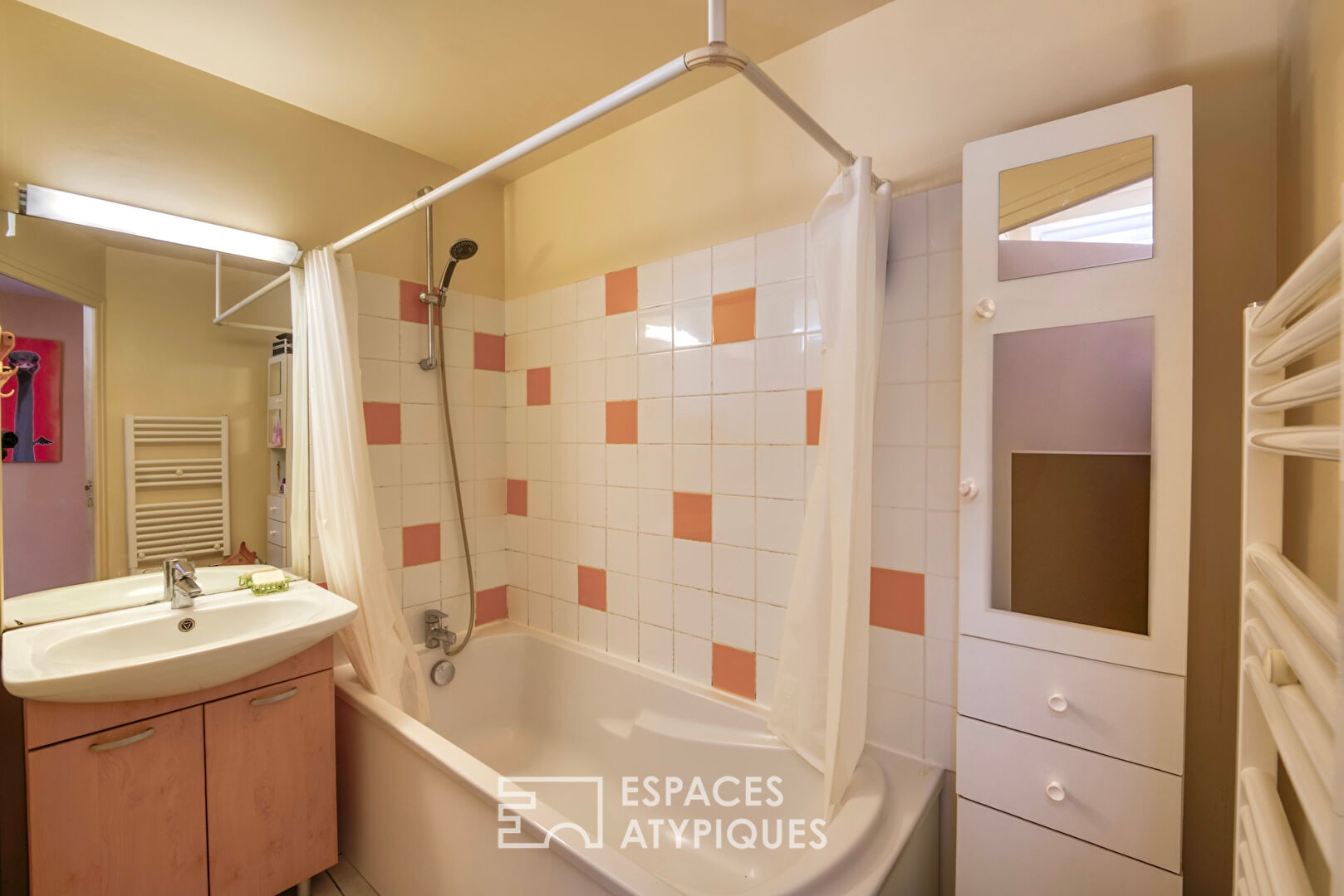De l’autre côté, le palier dessert également la salle de bain et un wc indépendant.