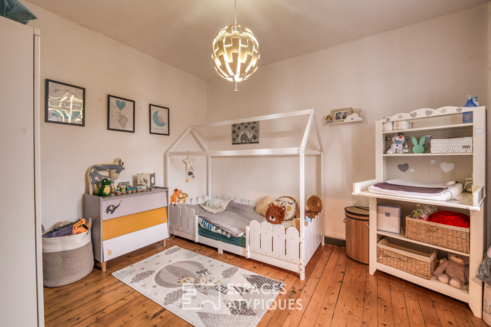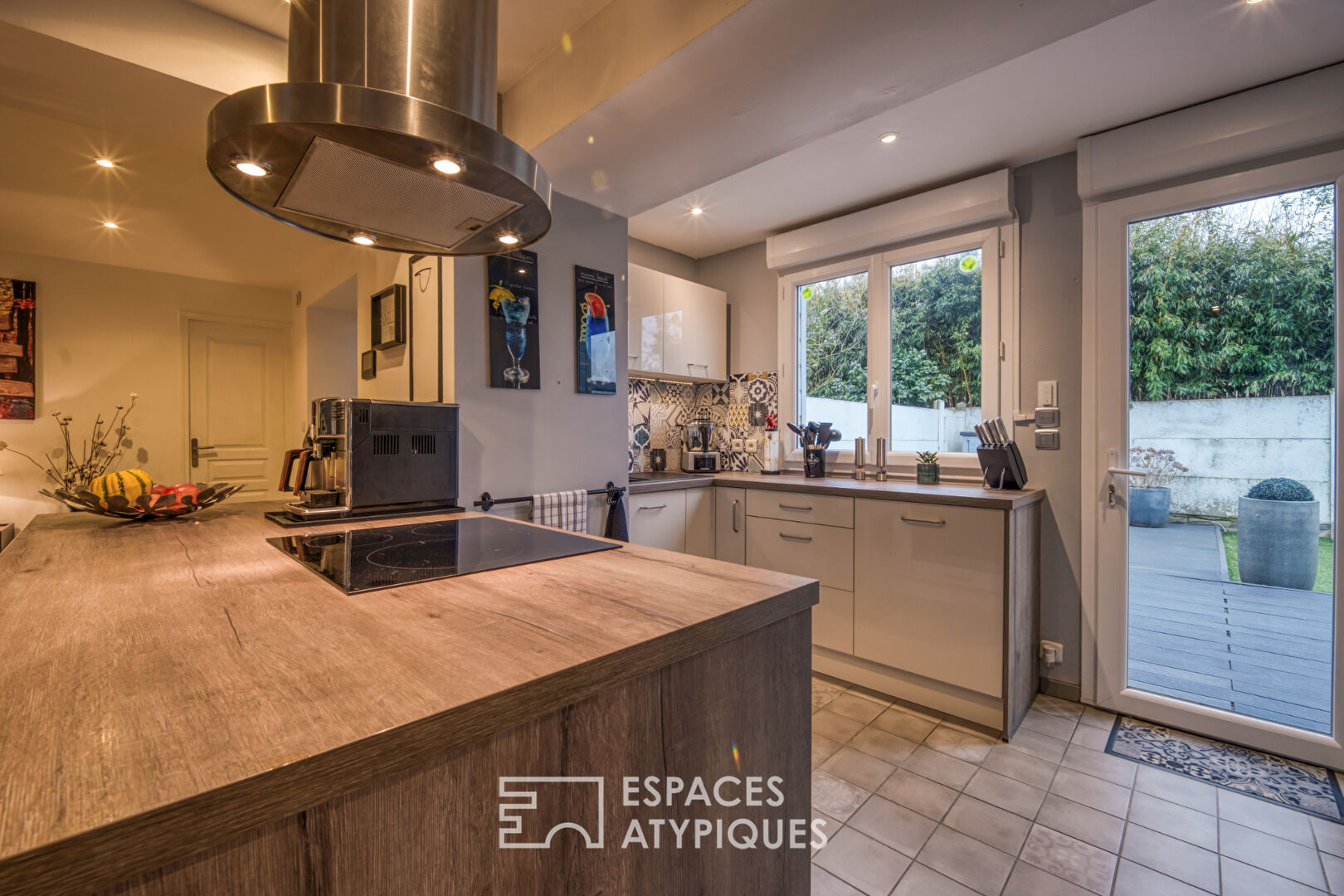 À l’intérieur, les volumes sont optimisés pour offrir un confort de vie optimal. Le séjour spacieux et lumineux s’ouvre sur un espace mezzanine qui apporte cachet et caractère à la maison. La décoration contemporaine aux lignes épurées est sublimée par un escalier métallique au design industriel, renforçant l’aspect atypique du bien. La cuisine ouverte, fonctionnelle et moderne, s’intègre parfaitement dans cet espace convivial.