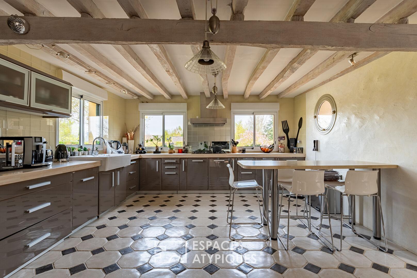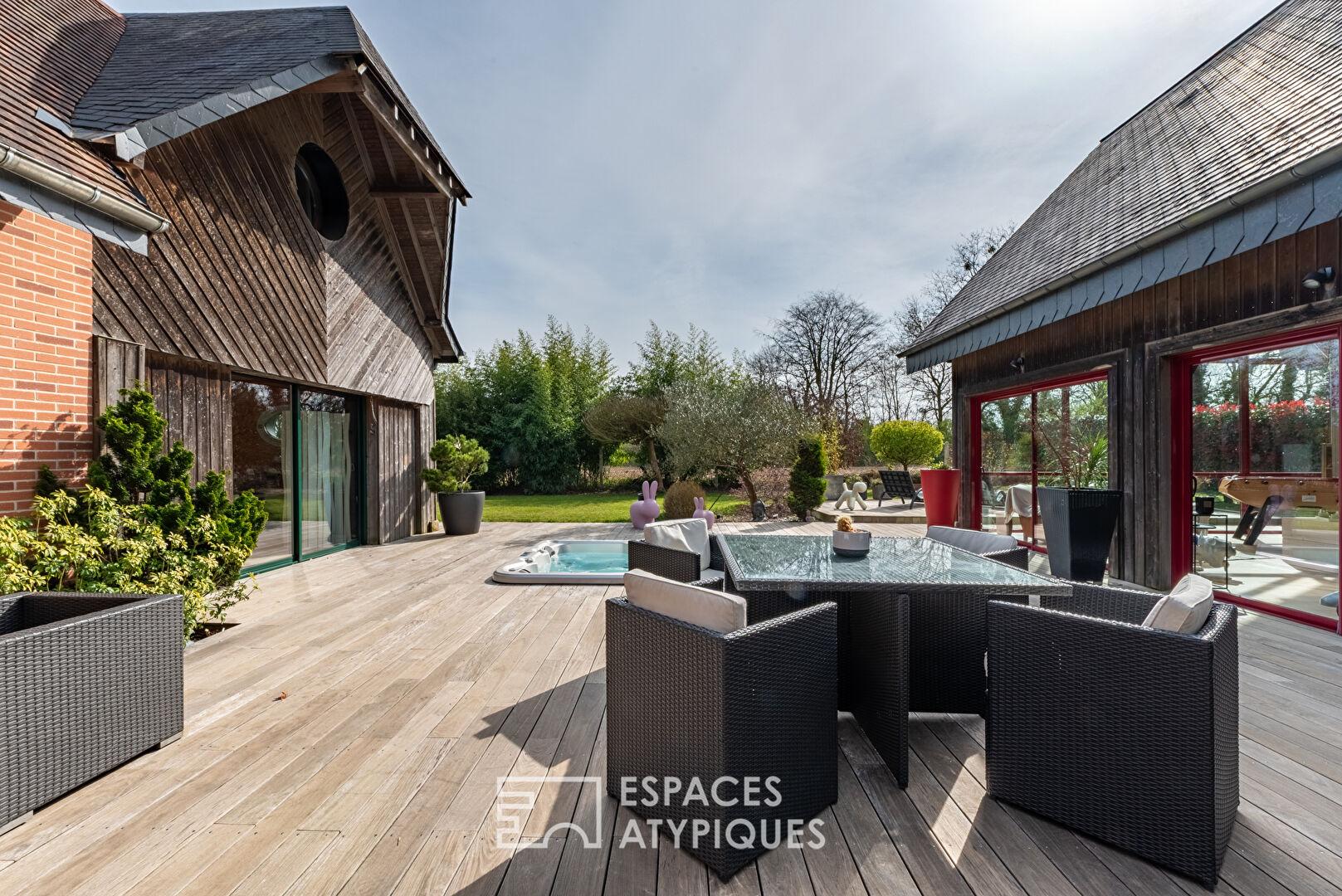 Implantée dans un cadre préservé au coeur du village de Morgny-la-Pommeraye, à seulement 25 minutes de Rouen, cette maison d’architecte construite en 2006 offre aujourd’hui 242 m² aux volumes spacieux et à l’architecture unique, le tout au sein d’un écrin de verdure sans vis-à-vis.