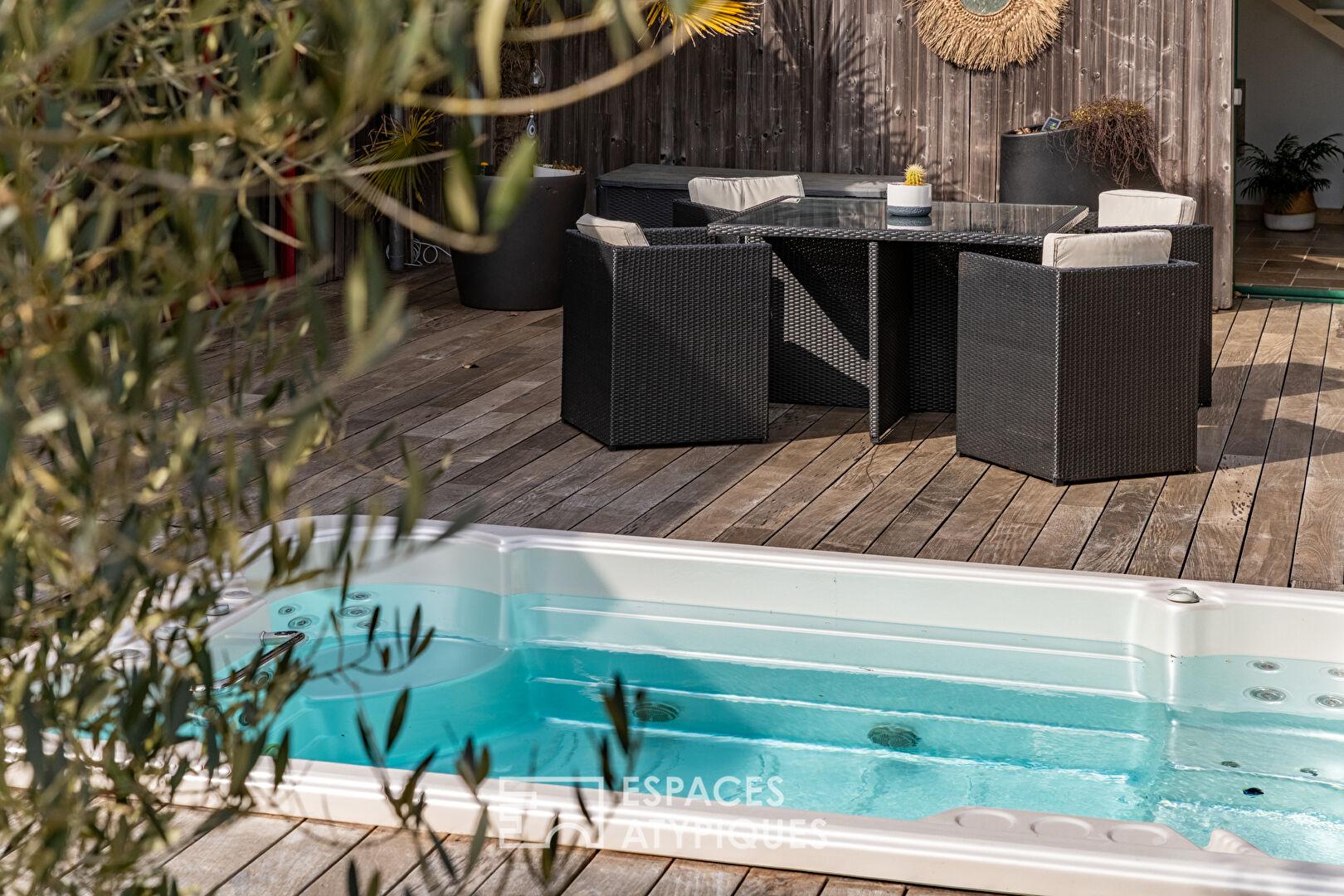Un bureau, idéal pour le télétravail, s’ouvre discrètement depuis le hall, avant de laisser place à une vaste cuisine équipée conviviale. Celle-ci se prolonge naturellement vers une salle à manger baignée de lumière, tournée vers la terrasse. À l’abri des regards, cet espace extérieur accueille un jacuzzi intégré, véritable invitation à la détente en toute intimité.