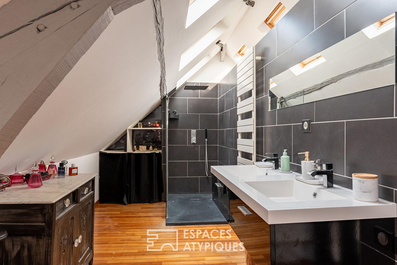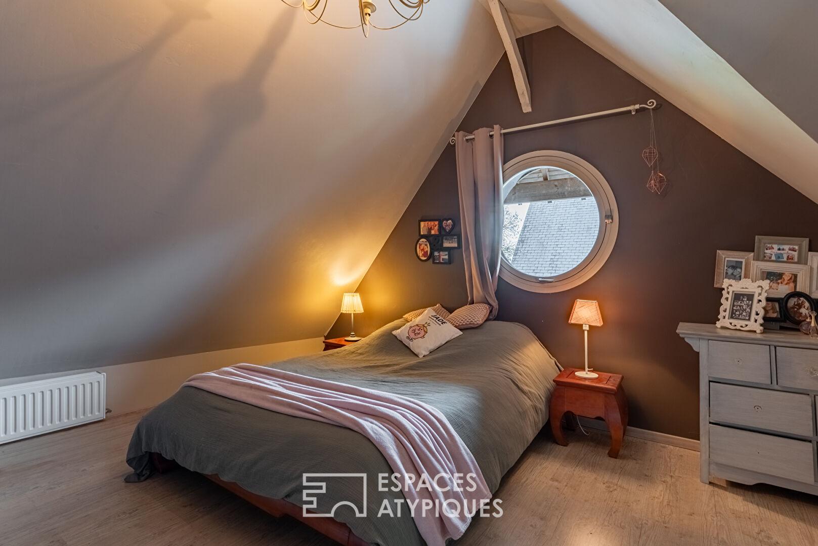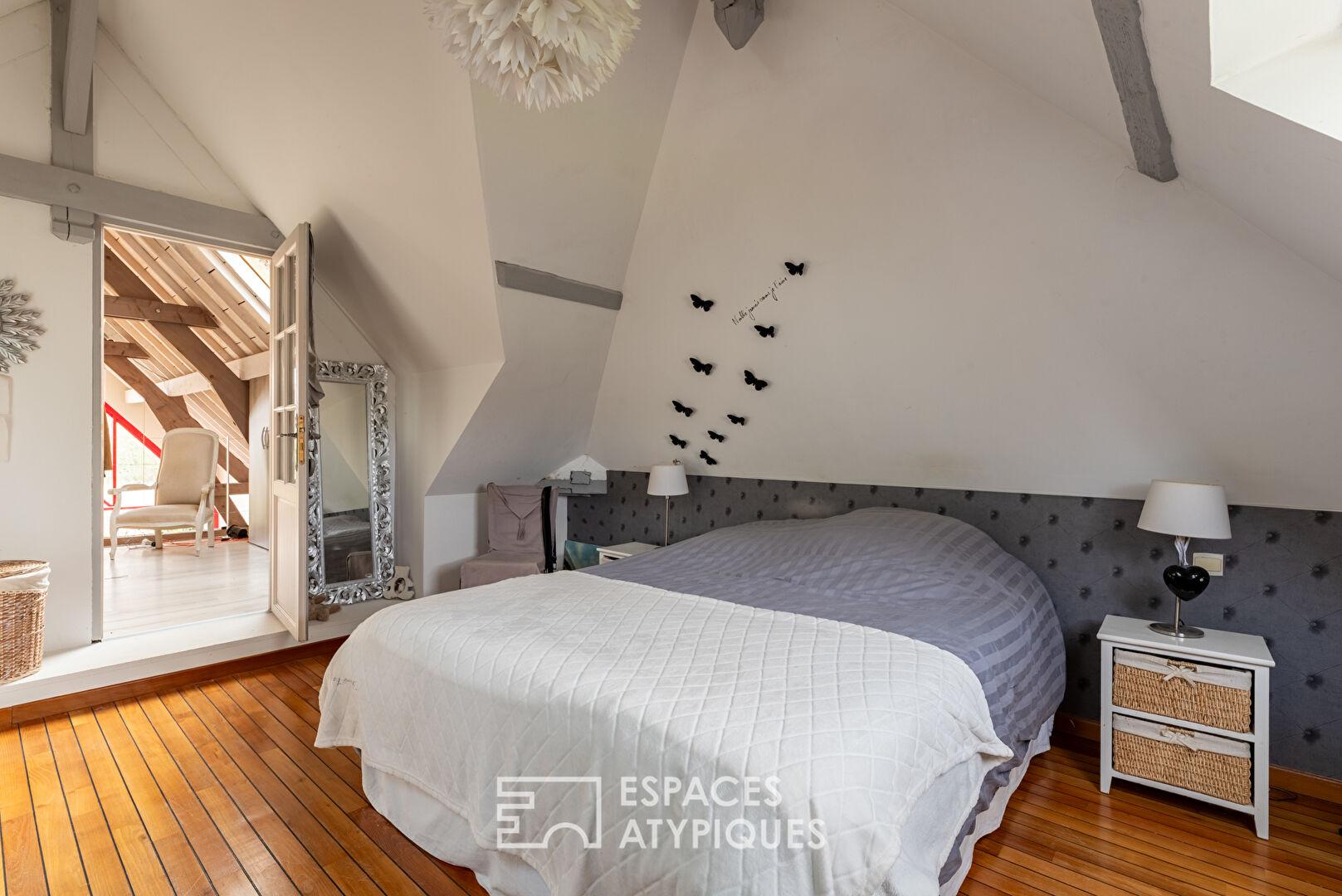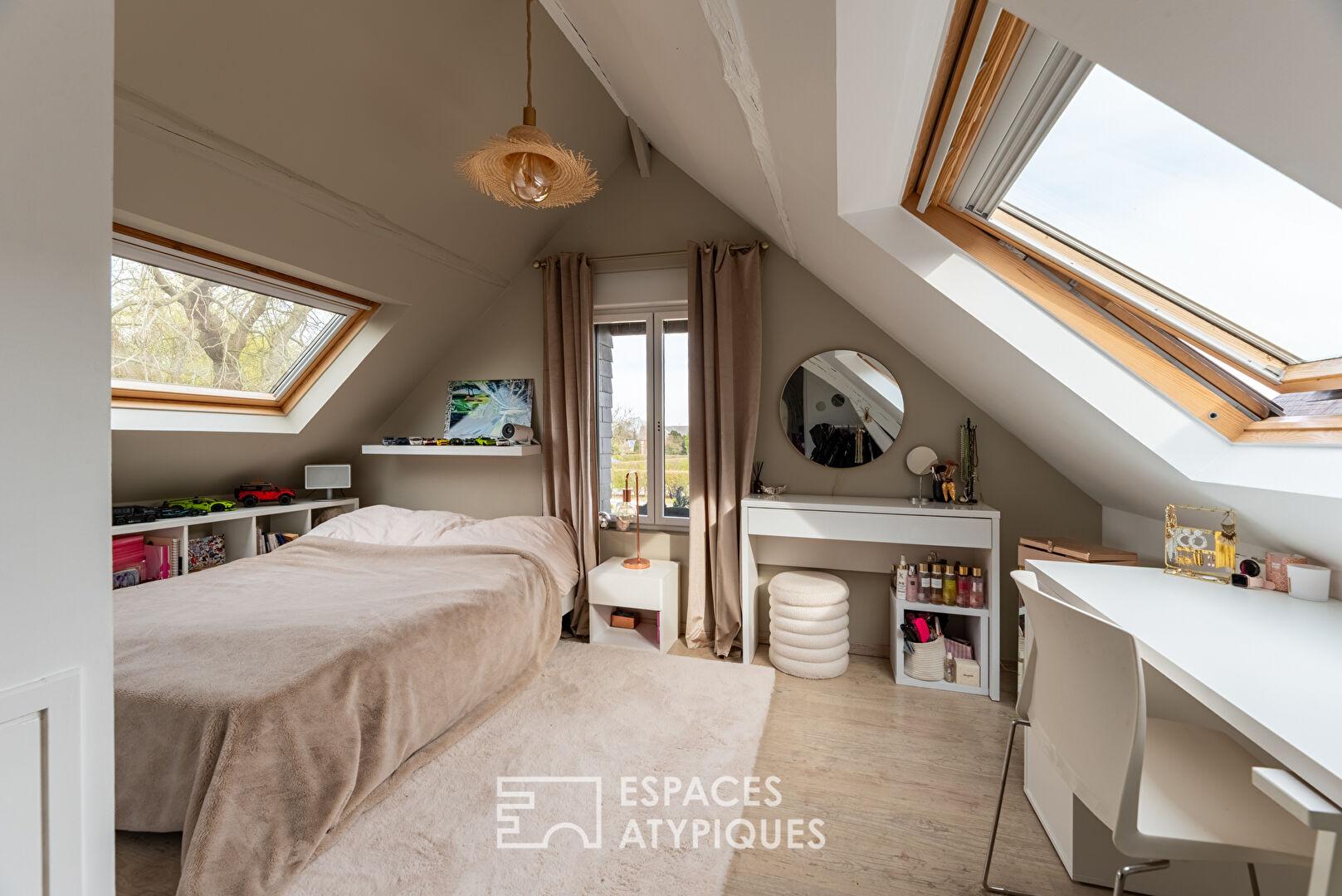 À l’étage, le palier distribue une organisation pensée pour le confort de chacun : une pièce aujourd’hui aménagée en dressing, une salle de bain, deux chambres, ainsi qu’une suite parentale aux volumes généreux.