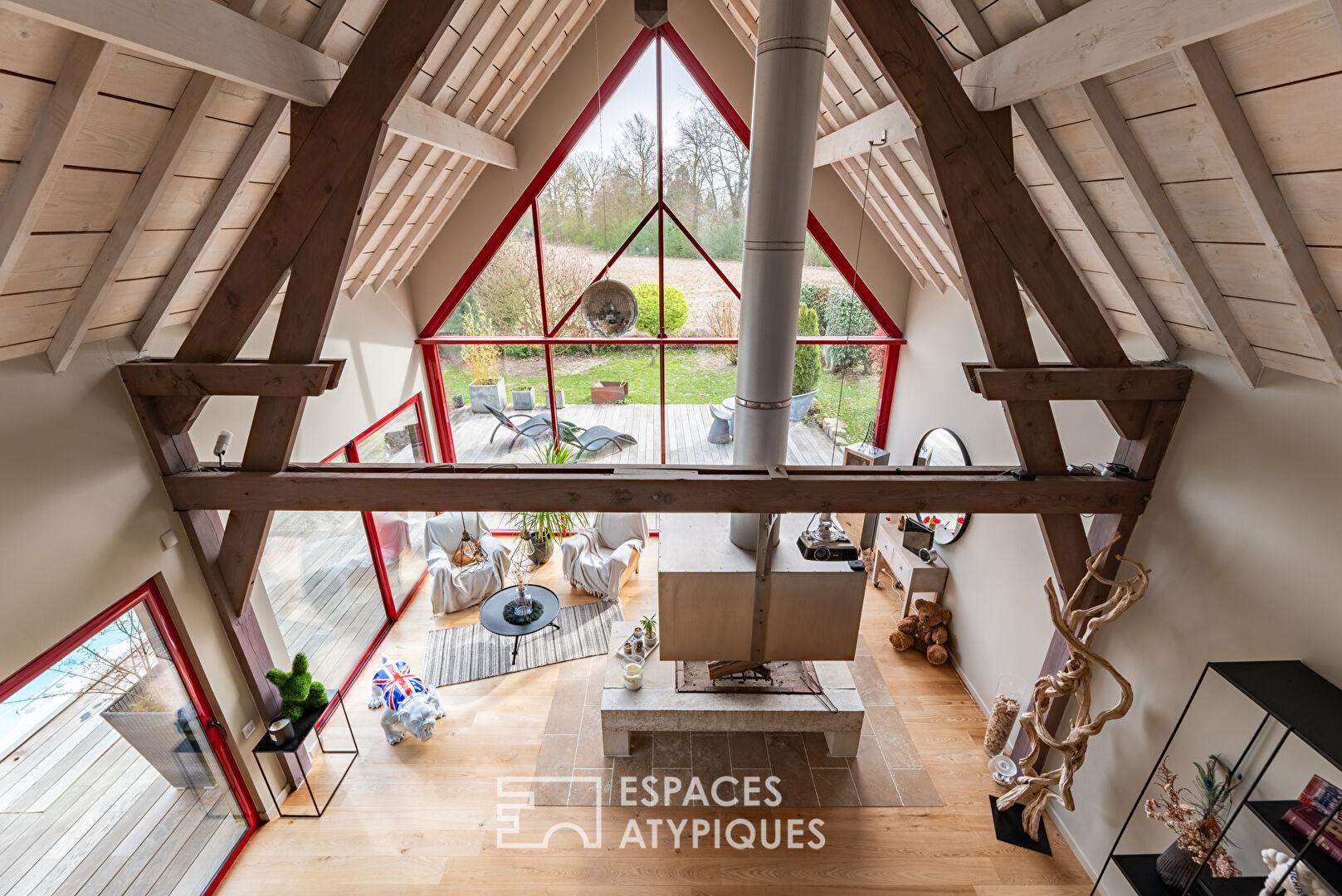 Sublimé par une cheminée centrale et une impressionnante ouverture sur pignon, cet espace devient le coeur de la maison, propice aux moments de partage et aux soirées d’hiver au coin du feu.