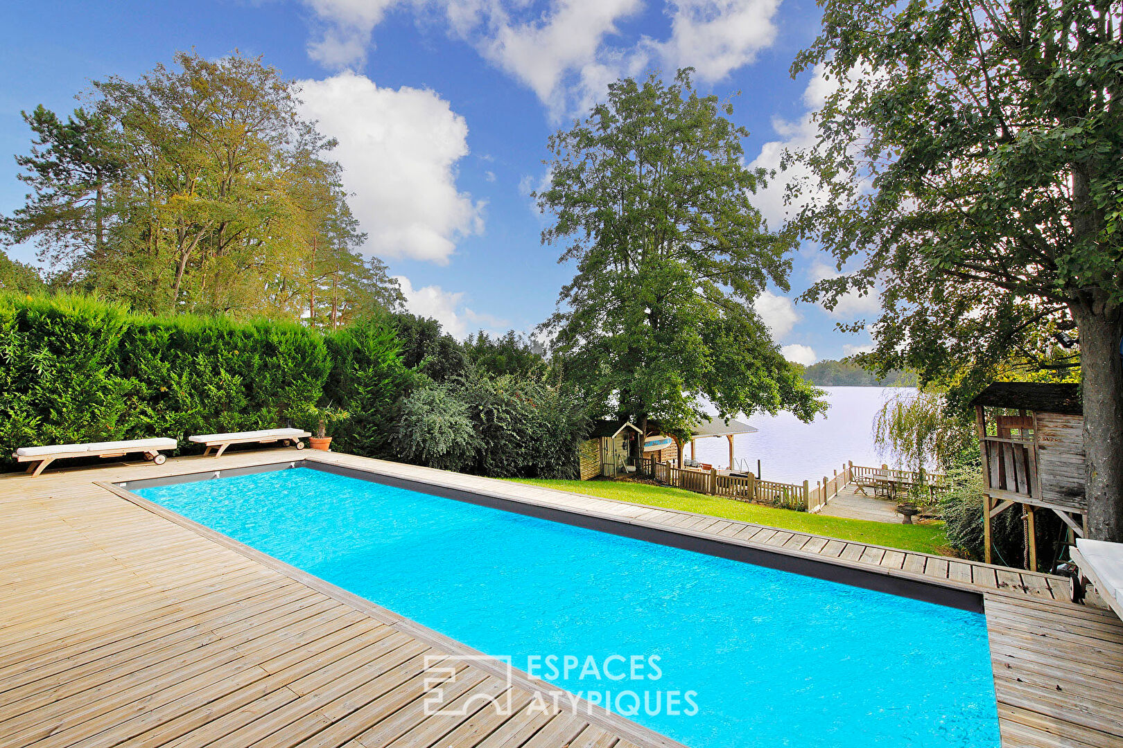 A l’extérieur, la terrasse couverte et cette vue imprenable invitent à la détente, en profitant de la piscine chauffée et sécurisée, dans le jardin ainsi que sur le spacieux ponton et le garage à bateau surplombant le lac.