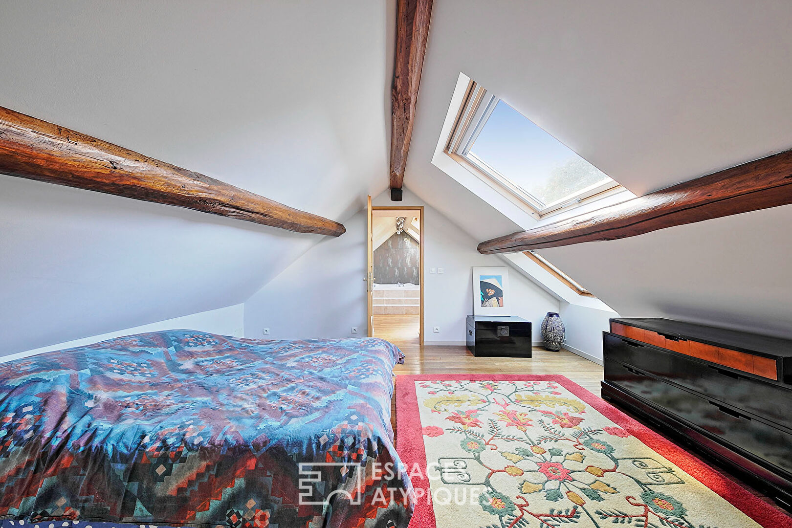 À l’étage, accessible par deux escaliers distincts, on y retrouve un bureau, un dégagement, une suite parentale avec salle de bain et toilette, une autre chambre et une pièce sur deux niveaux vous donnant plusieurs possibilités d’aménagement.
