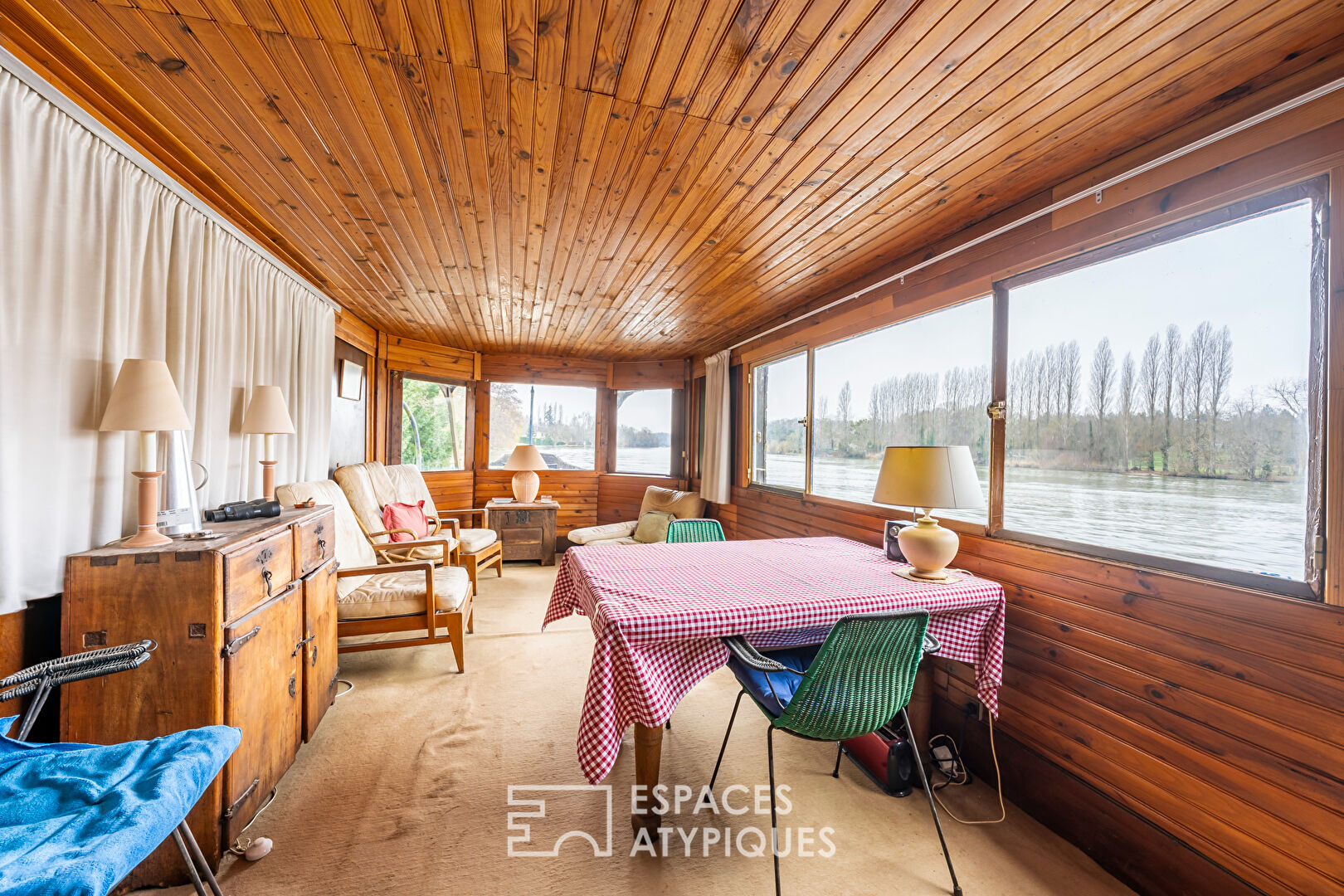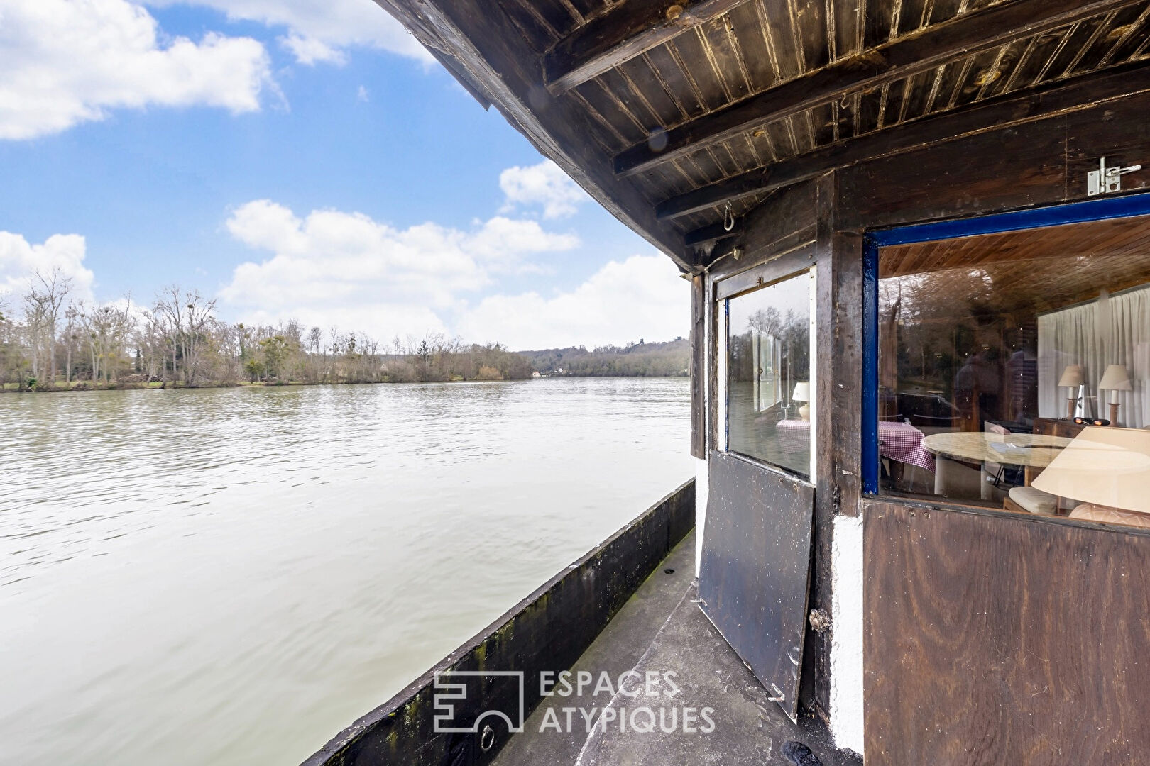 Sur la commune prisée de Seine-Port, proche de toutes les commodités, ce bateau non motorisé est aménagé en un logement fixe sur l’eau.
