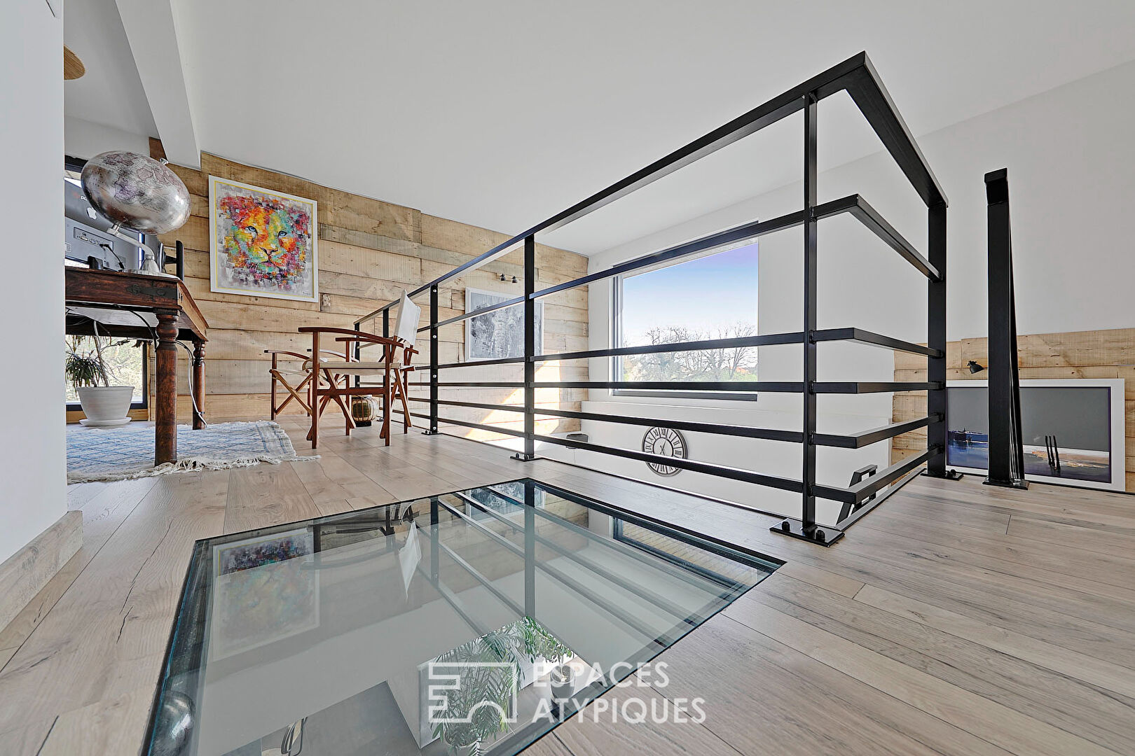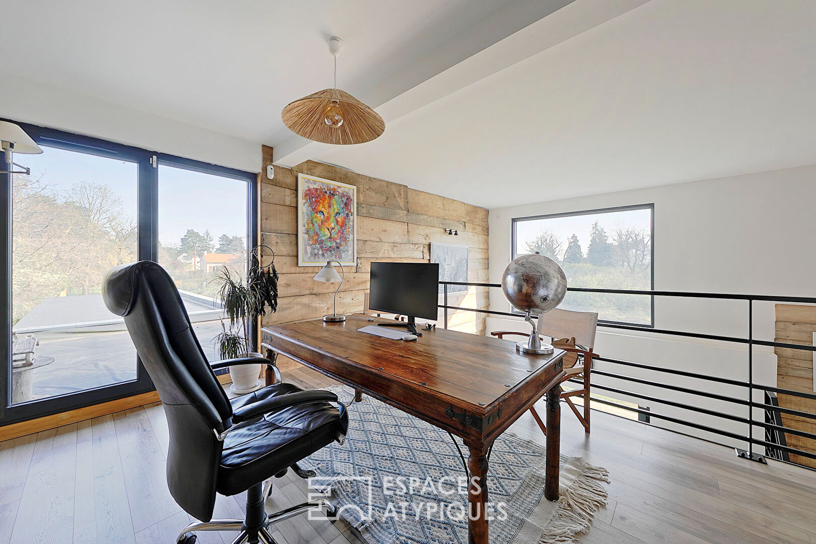À l’étage, accessible par un escalier en métal conçu sur mesure, un espace bureau en mezzanine surplombe élégamment le séjour et s’ouvre sur un toit-terrasse. Deux chambres lumineuses, chacune dotée de son propre accès à un toit-terrasse, offrent un cadre de vie privilégié. Une salle d’eau avec douche à l’italienne et WC complète harmonieusement ce niveau.