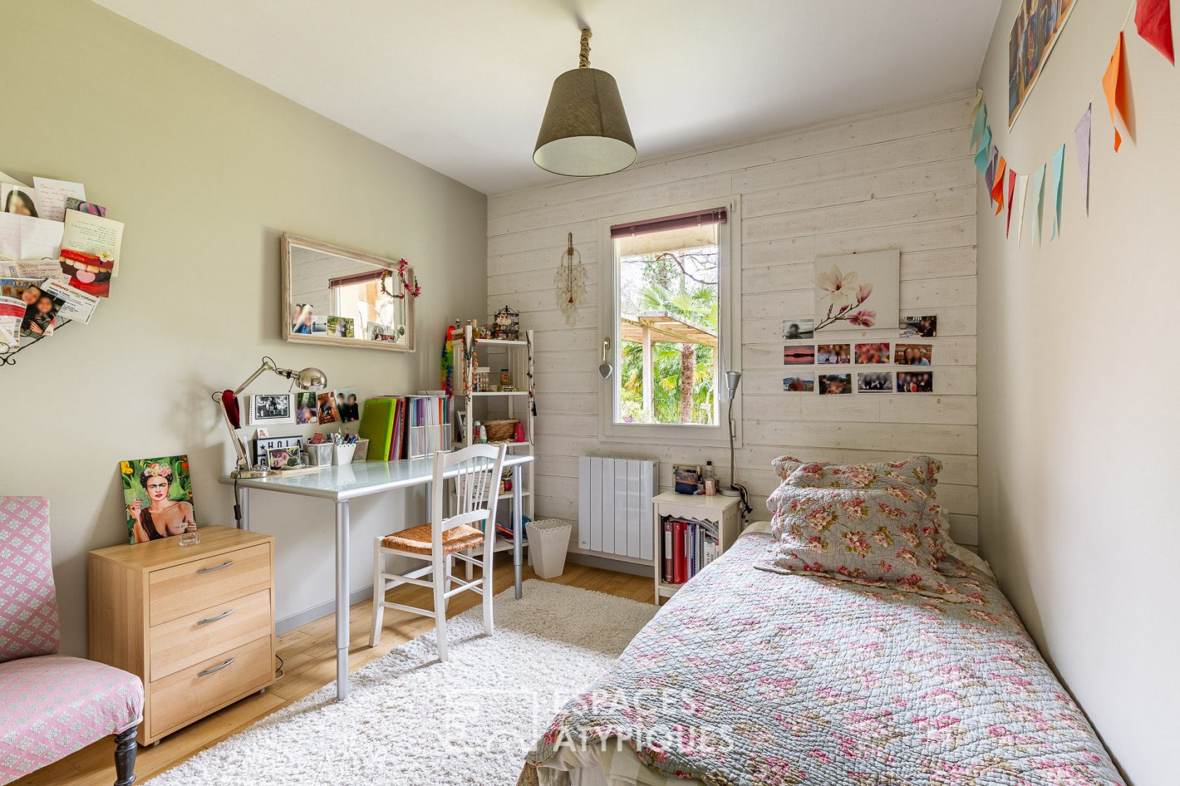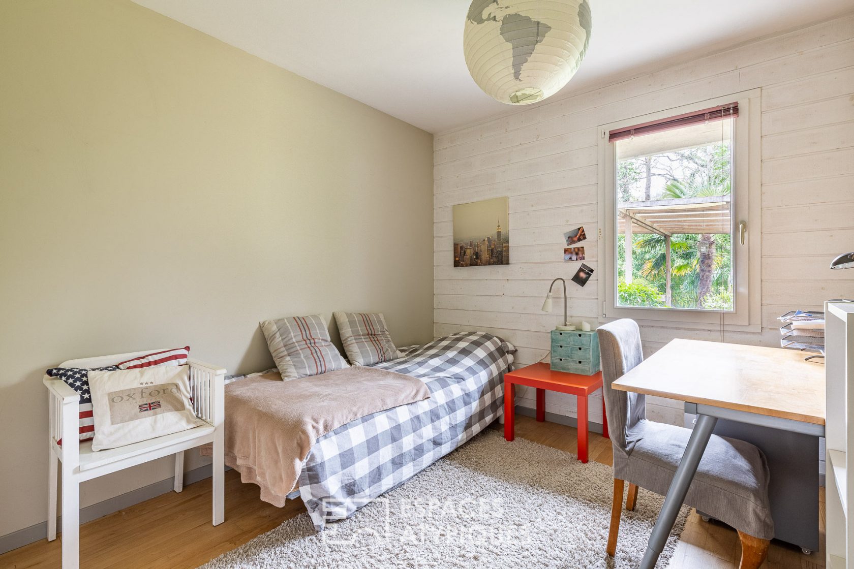 De l’autre côté, se trouvent une cuisine indépendante aménagée et équipée et une pièce dédiée à la buanderie. Un long couloir dessert quatre chambres. Trois d’entre elles se partagent une salle d’eau et la quatrième est une deuxième suite parentale avec sa salle de bain, son dressing et son accès sur le jardin.