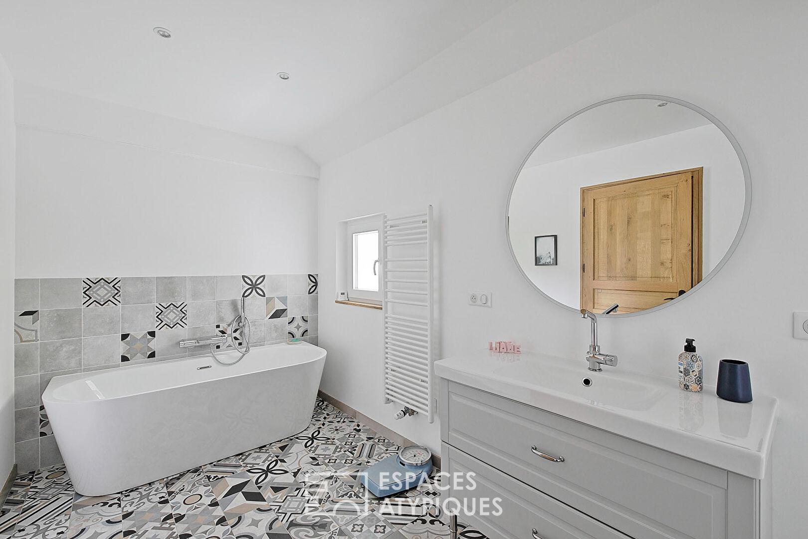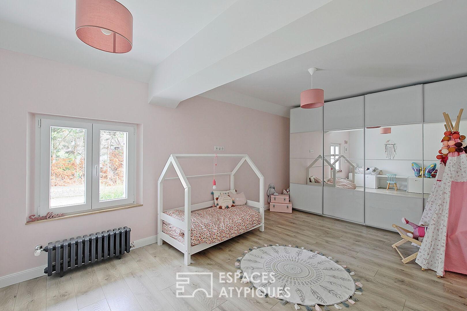 L’étage accueille d’un côté une chambre parentale avec sa salle d’eau et son dressing aménagé sur mesure. De l’autre côté, se trouvent deux grandes chambres pour enfant. Elles se partagent une salle de bains avec baignoire, douche et sanitaire.