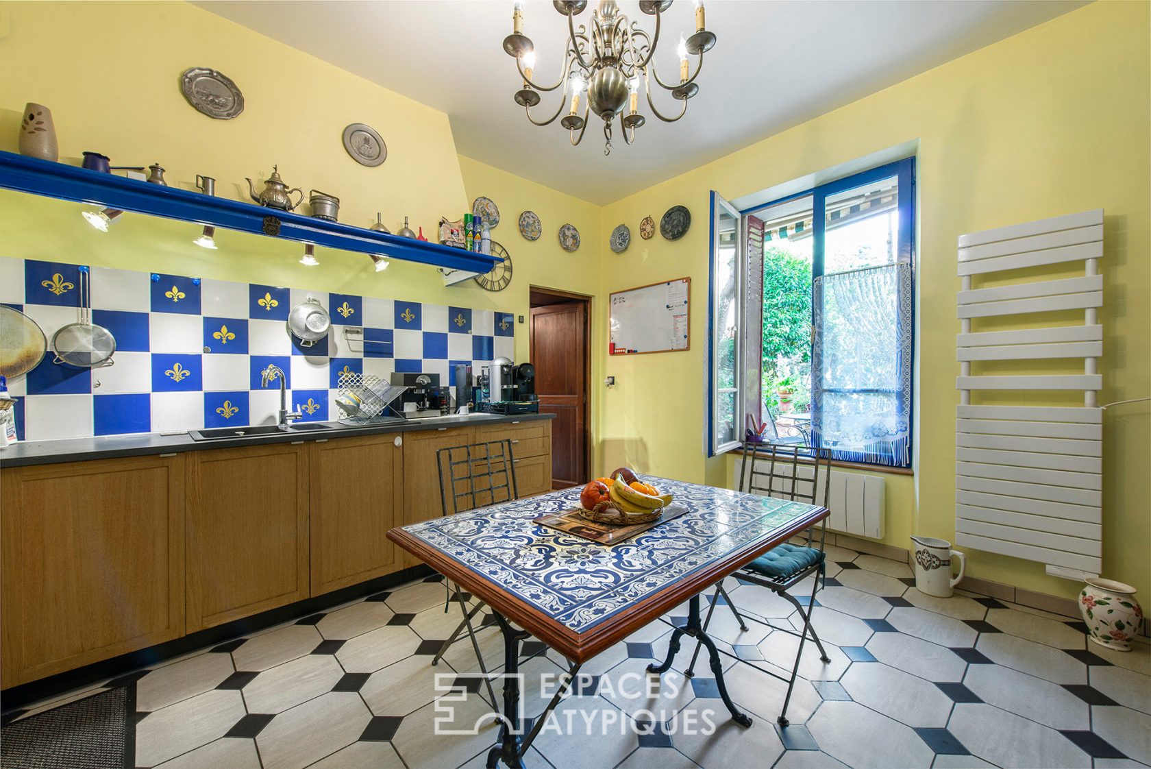Le rez de jardin est composé d’un hall d’entrée revêtu de tomettes, suivi d’une pièce de vie de 35m2 chaleureuse, avec ses poutres décorées, ses boiseries, sa cheminée. Un espace bibliothèque/bureau puis une spacieuse cuisine aménagée complètent ce niveau. Ces pièces bénéficient de l’accès direct au jardin et à la terrasse.