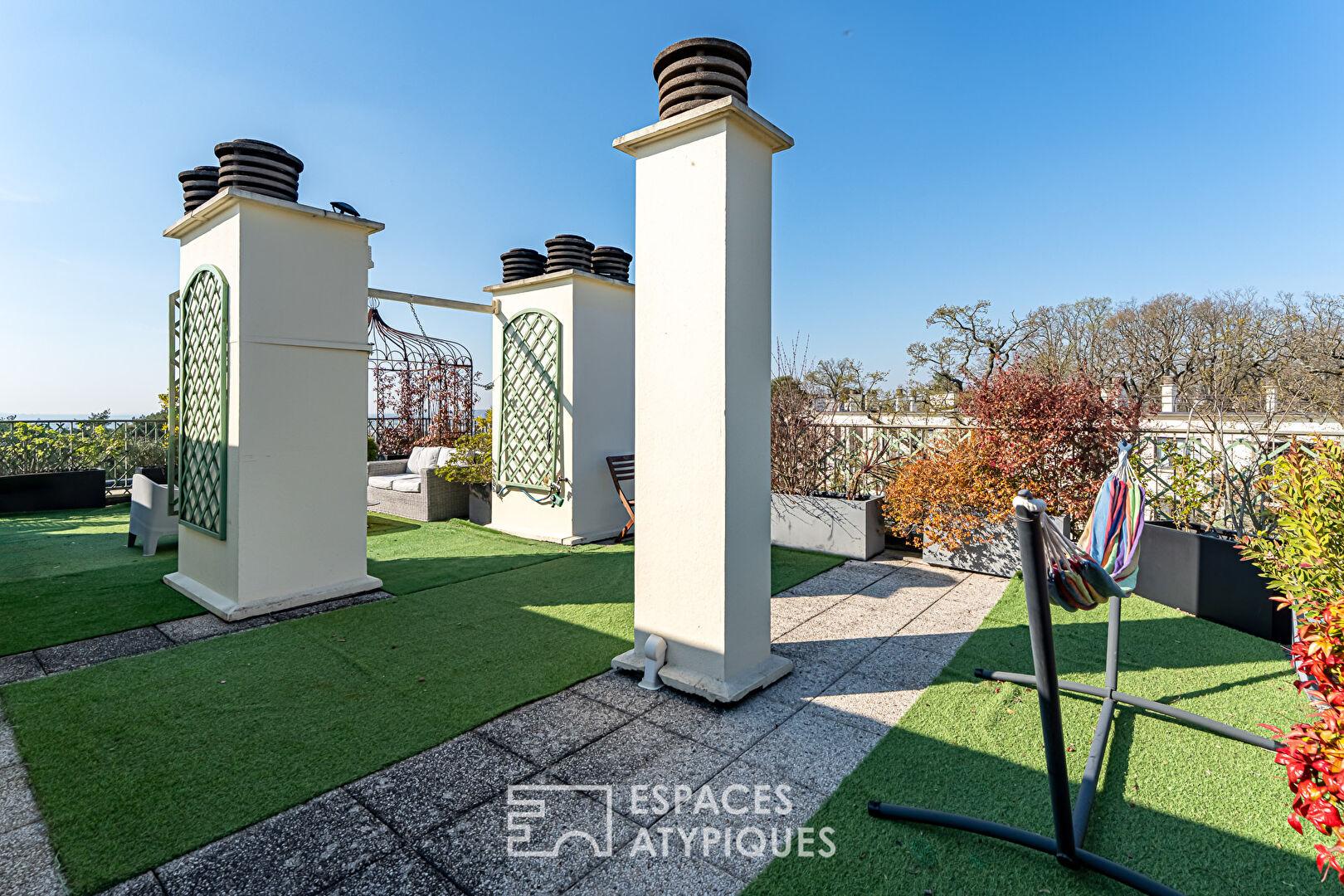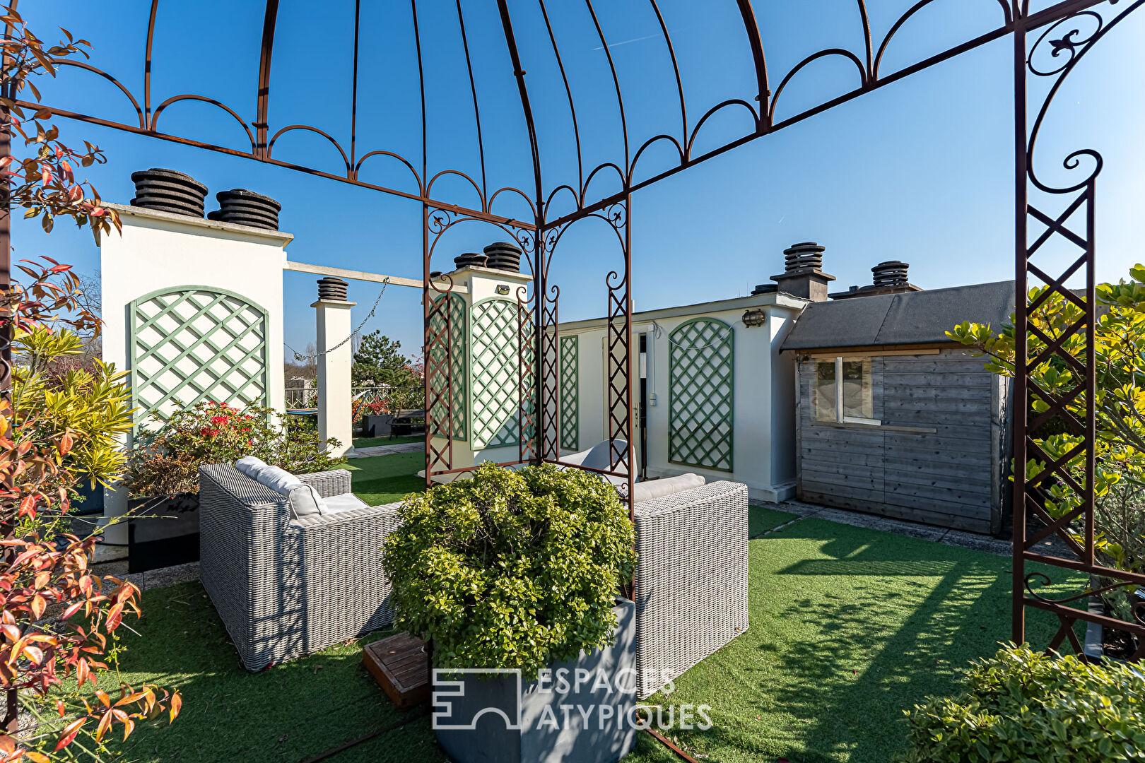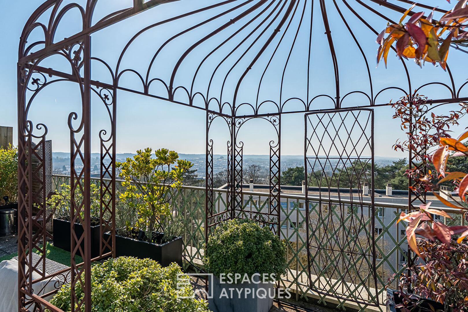 Un toit terrasse exceptionnel de 85 m² (lot privatif), accessible par les parties communes, a été entièrement aménagé avec pergola, cabanon de jardin, arrosage automatique, électricité, afin de profiter des beaux jours ensoleillés et d’une vue à 360° sur Versailles.