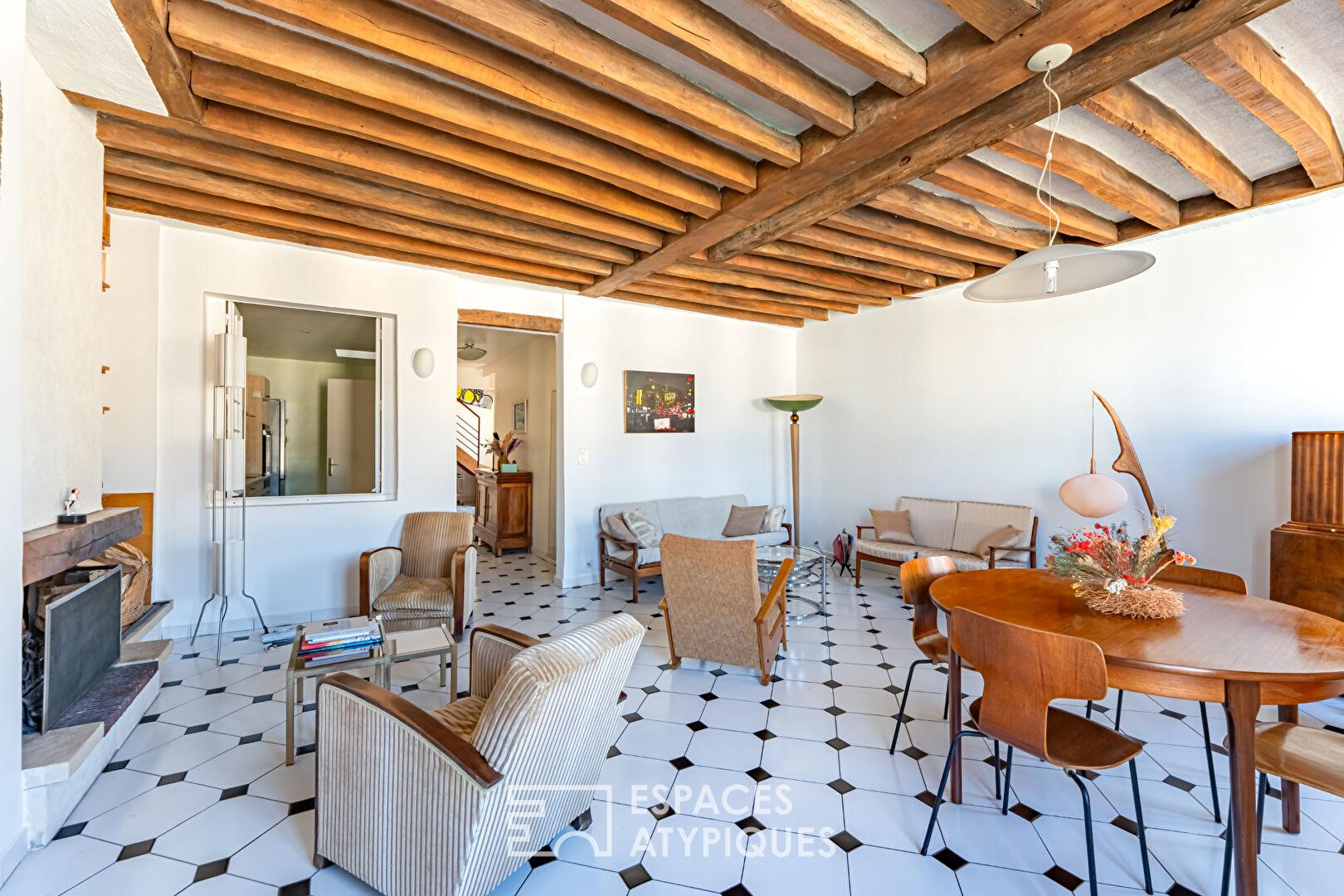 Le couloir mène à la grande pièce à vivre de 30 m², très lumineuse, aux poutres d’origine qui est agrémentée d’une cheminée ouverte fonctionnelle. Une fenêtre intérieure donne sur la cuisine pour plus de luminosité, une verrière atelier pourrait facilement la remplacer pour ajouter une touche contemporaine.