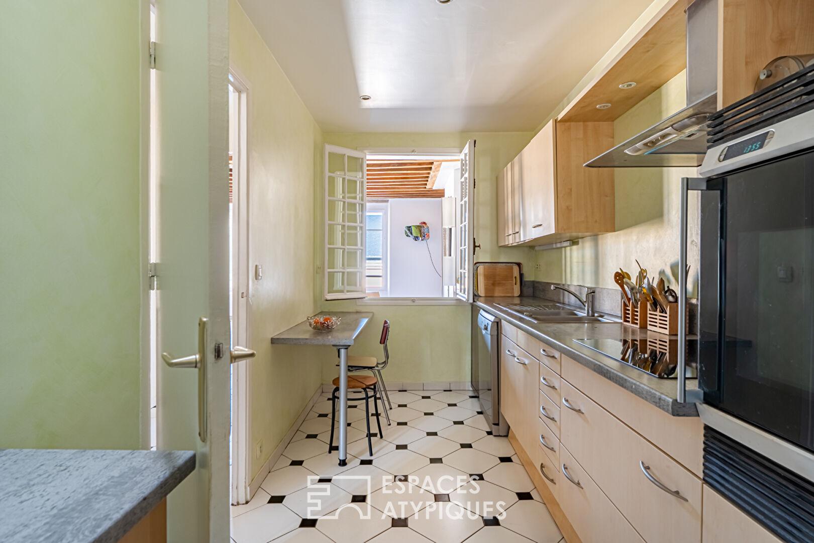 De l’entrée, un couloir distribue d’un côté une salle d’eau avec WC, et de l’autre, une cuisine fermée aménagée avec un puit de lumière en carreaux de verre.