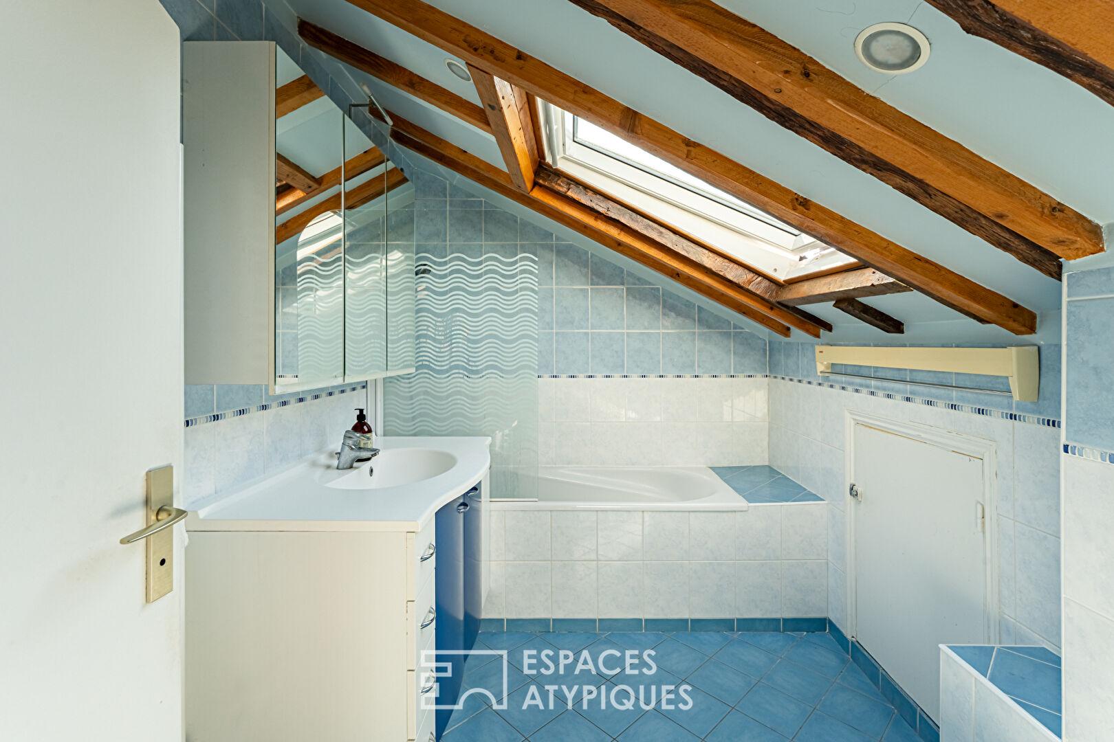A l’étage, un palier bibliothèque distribue une chambre sous combles de 14 m² (9 m² Carrez), la belle chambre parentale de 27 m² (20 m² Carrez) et une salle de bains avec WC.