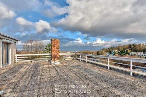 Cet appartement situé au 3e et 4e étage d’un immeuble de 1965, qui surplombe la charmante commune de Port Marly, profite d’une vue dégagée et imprenable de la forêt de Marly à la Défense. Une large entrée distribue la spacieuse cuisine indépendante de 20 m², la généreuse pièce de vie de 53 m² baignée de lumière et agrémentée d’une cheminée. Elle dessert le couloir meublé de nombreux rangements, qui offre l’accès à l’espace nuit composé de deux agréables chambres, qui se partagent une salle de bains et une troisième qui bénéficie de sa salle de douche et d’un balcon de 10 m² relié au séjour. L’escalier hélicoïdal situé dans la pièce principale conduit à l’espace bureau vitré, exposition Est, puis à la suite parentale qui bénéficie d’un dressing ainsi que d’une agréable salle de bains. Cette chambre ainsi que le bureau profitent de l’accès à la terrasse privative de 96 m² sans aucun vis à vis, exposition sud, au dernier étage de cet immeuble entouré de verdure. Elle peut aussi se transformer en atelier d’artiste avec vue… Une cave et un garage double complètent les prestations de ce bien de qualité. Ce bel appartement très bien situé, offrant une vue imprenable, saura parfaitement s’adapter à vos envies. Ecole, crèche à proximité, Bus ligne 10 pour Saint Germain en Laye en 10 min. Gare de Marly le Roi en 13 min à pied A13 à 2,5 km Contact : SOPHIE 07 61 00 52 78 Copropriété de 81 lots (Pas de procédure en cours). Charges annuelles : 4800 euros. Sophie STANDERA Agent Commercial – Numéro RSAC : 832411144 – Paris