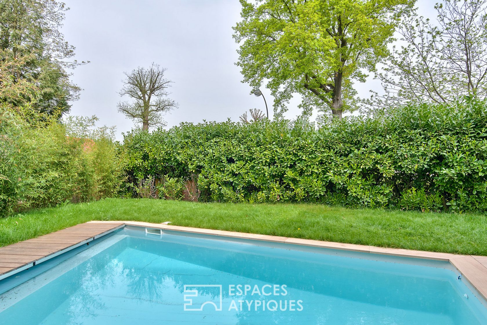 Son architecture en forme de L crée une ambiance de charme avec les reflets du bois sur l’eau, les immenses ouvertures sur la pièce à vivre et le rythme reposant des espaces nuit.