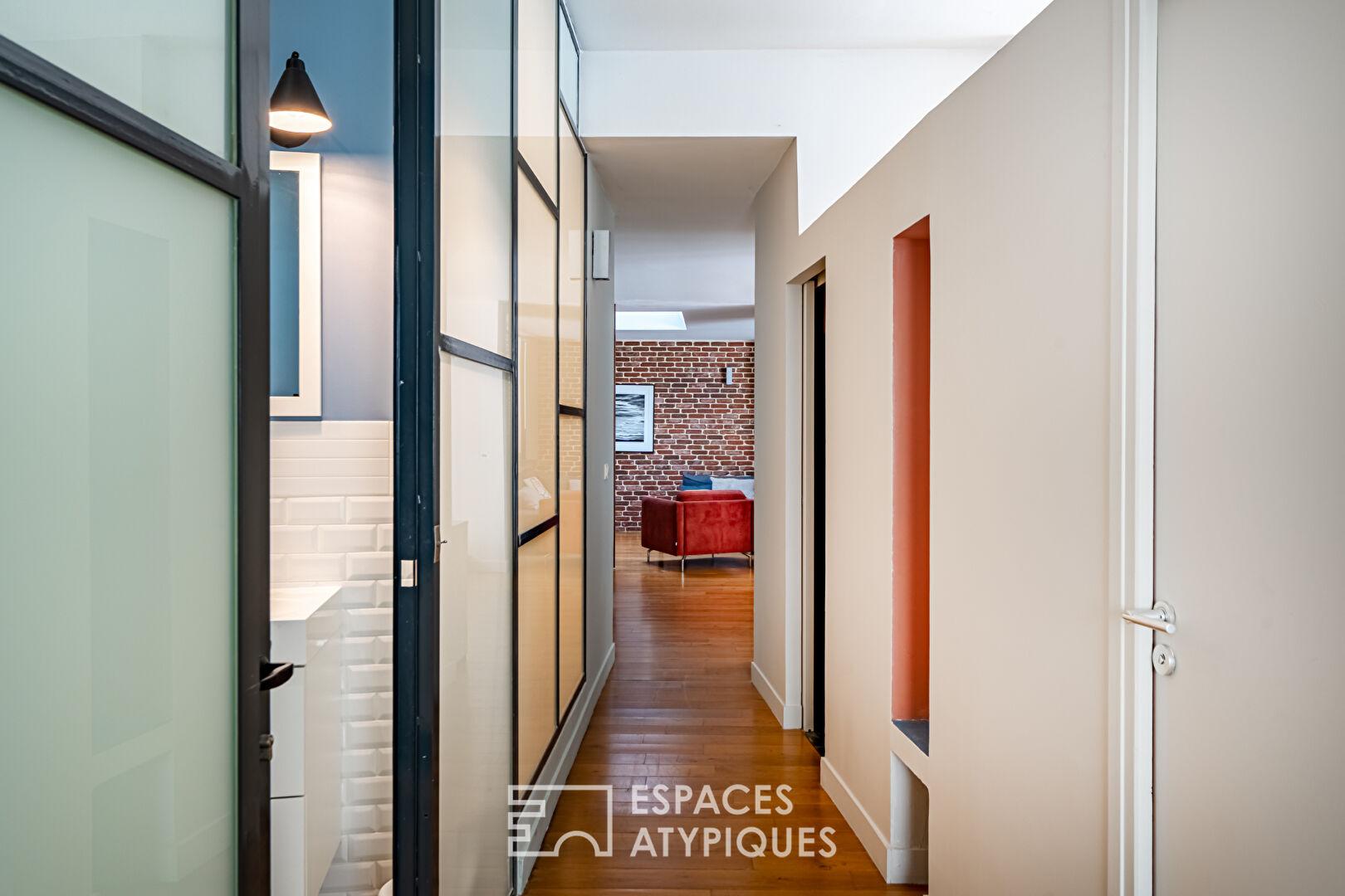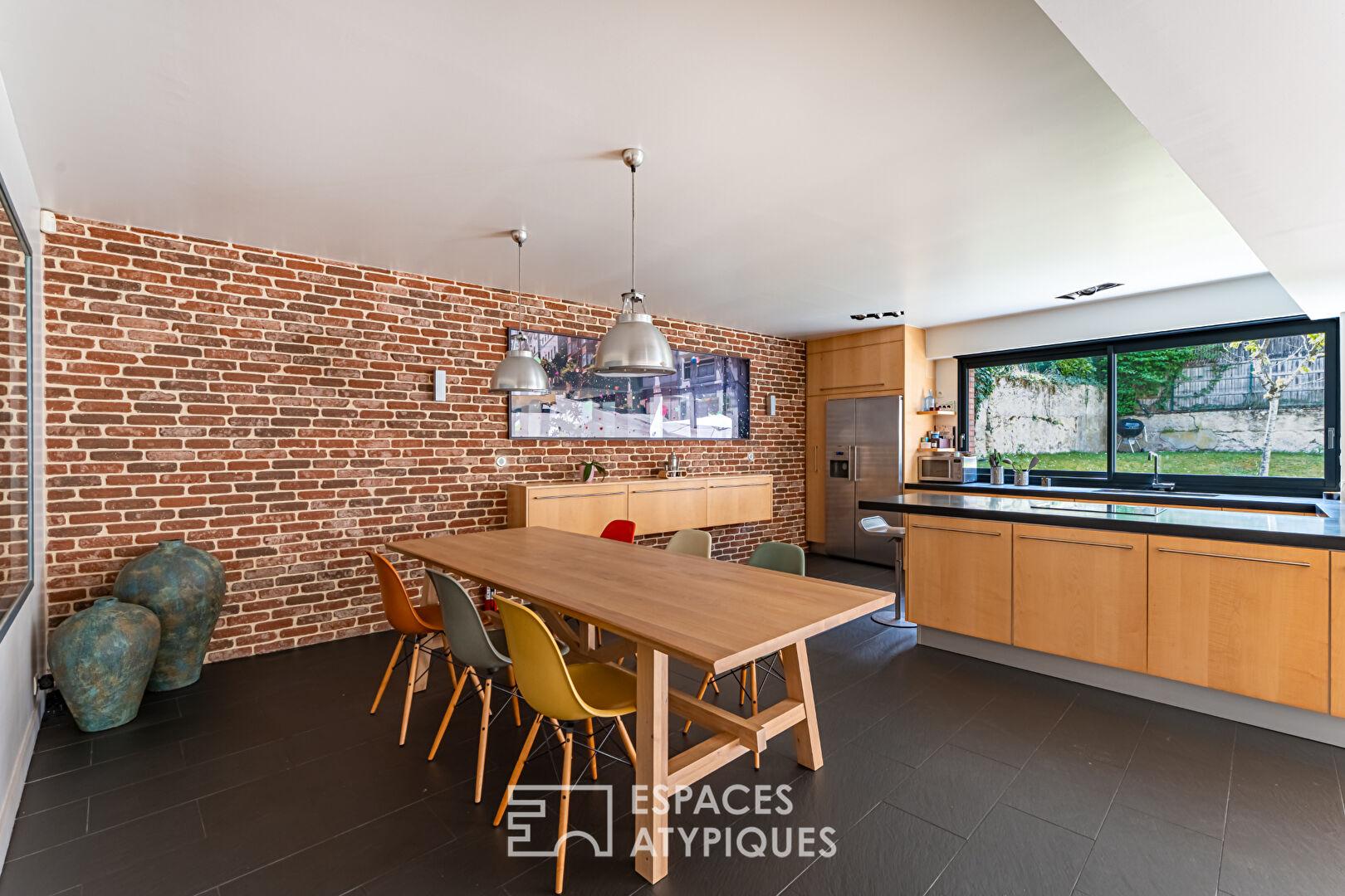 Un subtil jeu de niveaux délimite naturellement l’espace dînatoire et la cuisine. Ici, le sol se pare de grandes dalles sombres aux reflets ardoise, contrastant parfaitement avec le spectaculaire mur de briques apparentes qui insuffle une véritable âme new-yorkaise à l’ensemble. La cuisine ouverte, conviviale et parfaitement équipée, s’articule autour d’un généreux îlot central aux façades en bois clair. L’esprit architectural est par ailleurs souligné par une belle verrière intérieure qui offre des perspectives visuelles uniques et une profondeur traversante à la pièce.