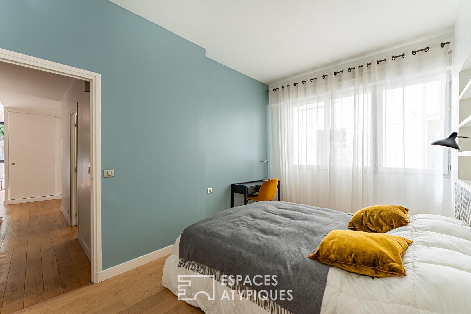 L’espace nuit, quant à lui, dévoile une magistrale suite parentale pensée comme une véritable bulle d’intimité. La chambre, baignée d’une lumière douce filtrée par de larges ouvertures, s’habille d’un élégant mur bleu céladon qui dialogue en parfaite harmonie avec le parquet massif.